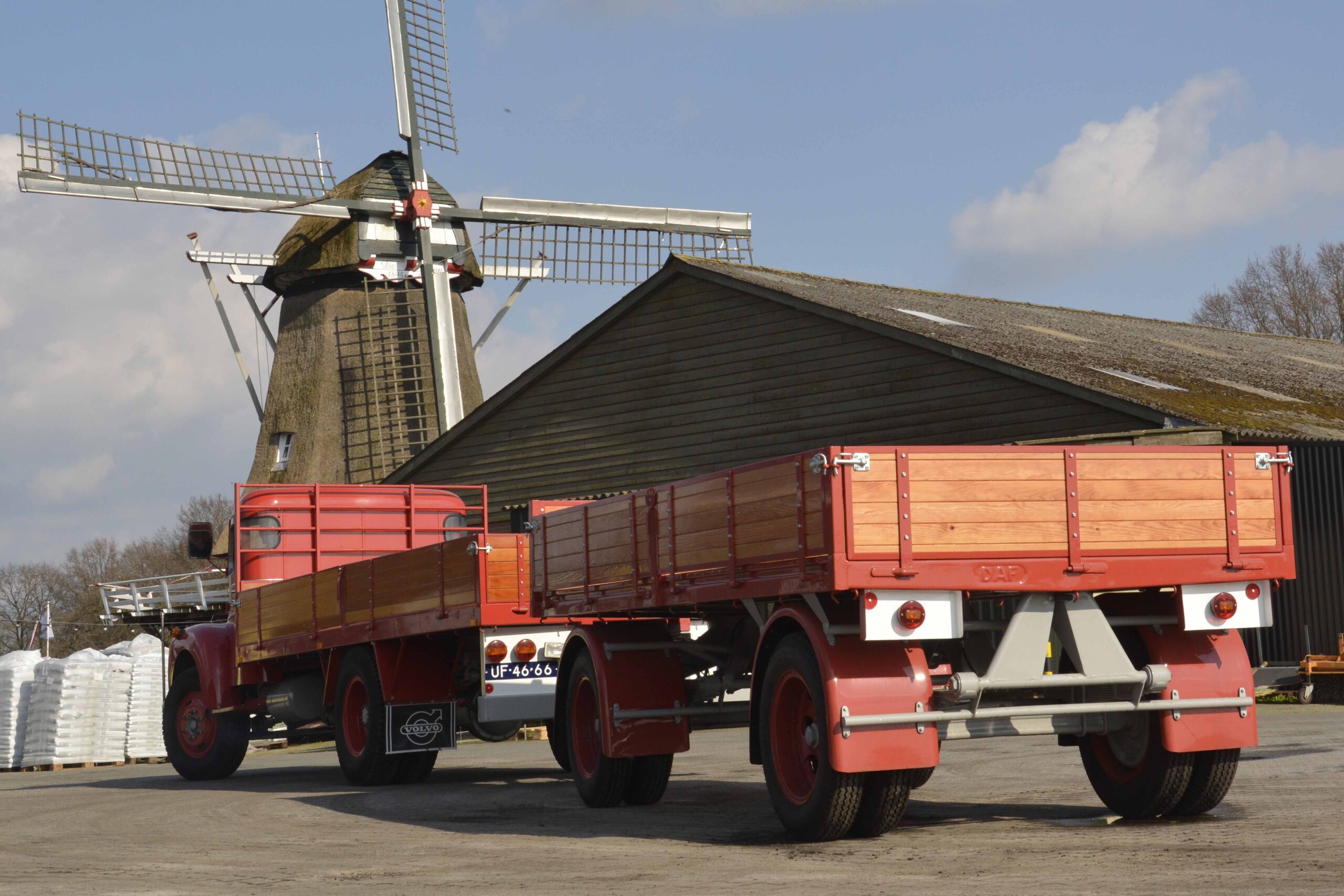 De prachtig gerestaureerde Volvo L465 uit 1963 met DAF-aanhanger van Herman Snijders maakt het perfecte plaatje bij korenmolen De Hoop in het Drentse Wachtum.
