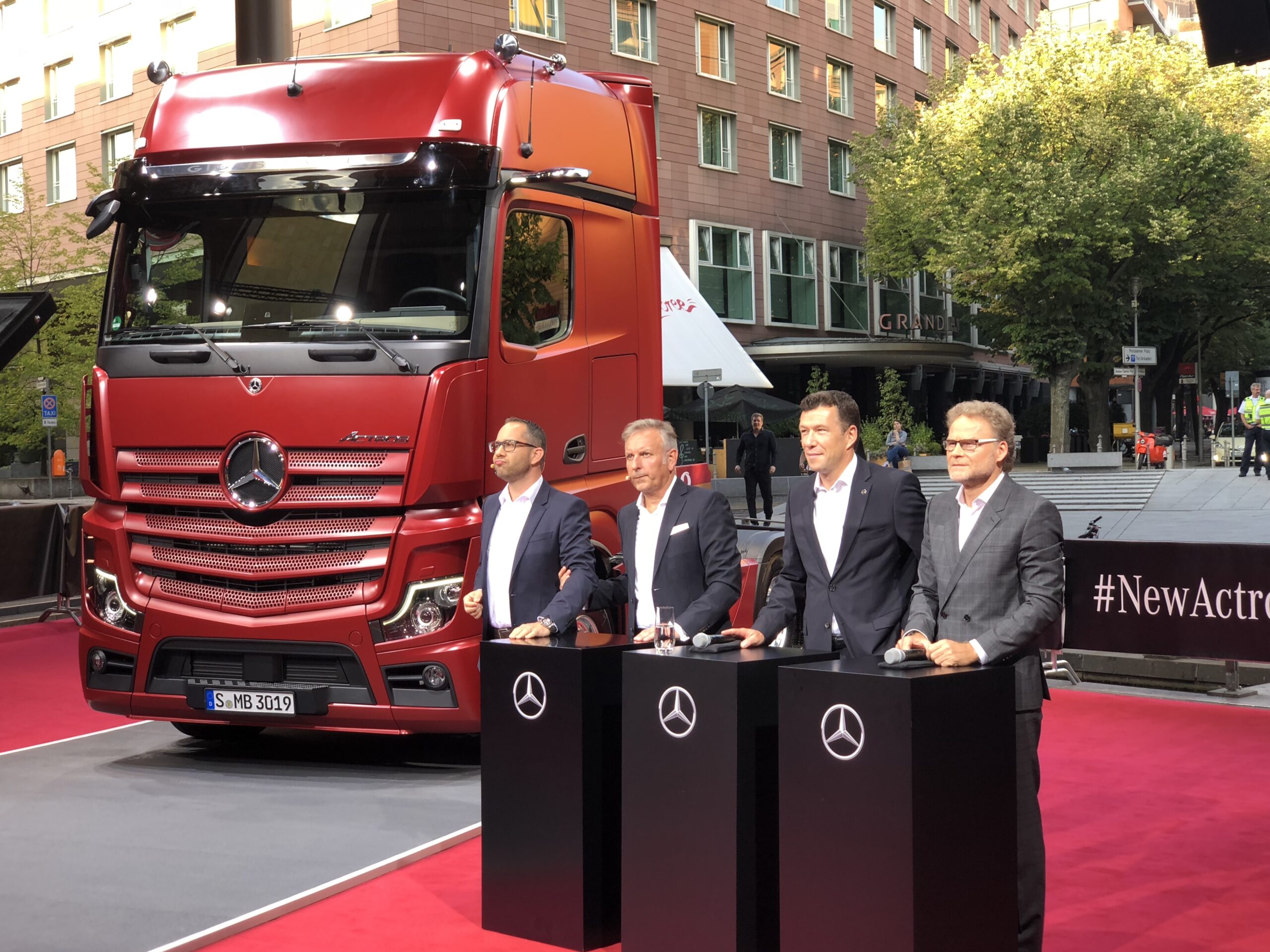 De nieuwe Actros kan zelfstandig sturen en heeft geen achteruitkijkspiegels meer. Mercedes introduceerde de nieuwe Actros vanavond op de Potsdamer Platz, midden in Berlijn.