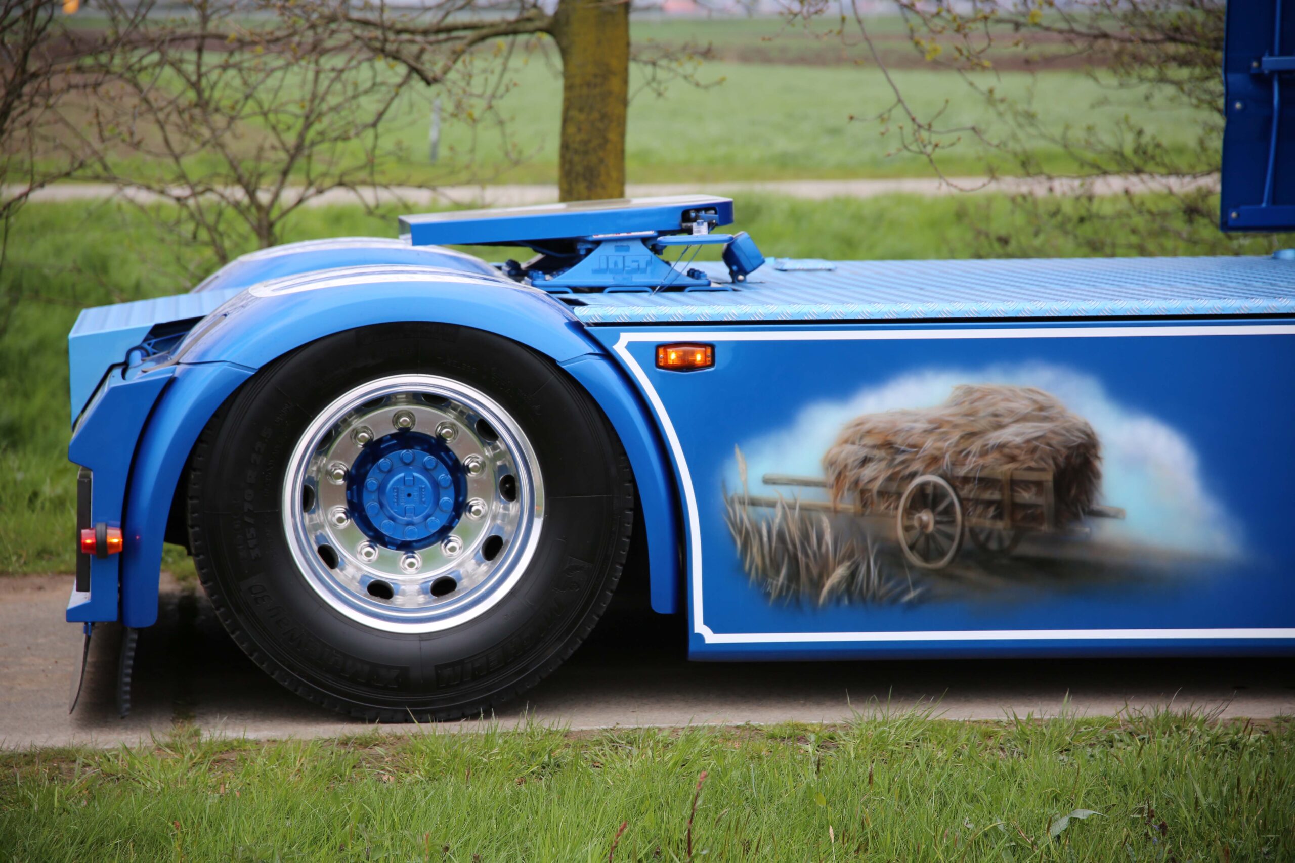 Voor de special paint op de auto vroeg Willeke van MW Designs om voorbeelden. Deze bleken echter nog niet zo gemakkelijk te vinden. Kenny wilde graag afbeeldingen van stoere trekpaarden op de cabine, aan het werk op het land. “Er waren wel wat foto’s, maar niet van wat ik in mijn hoofd had. Via een forum ben ik in contact gekomen met iemand die een aantal van die paarden heeft. Speciaal voor mijn zijn de paarden ingespannen en op het land aan het werk gegaan. Daarvan hebben we foto’s gemaakt en die zijn weer gebruikt als voorbeeld voor de special paint.” Een beetje omslachtig misschien, lacht Kenny, maar het resultaat is super. “Vooral de paint op de achterkant van de cabine vind ik echt heel mooi. Die waarop de boer met drie paarden voor de ploeg in de weer is.”