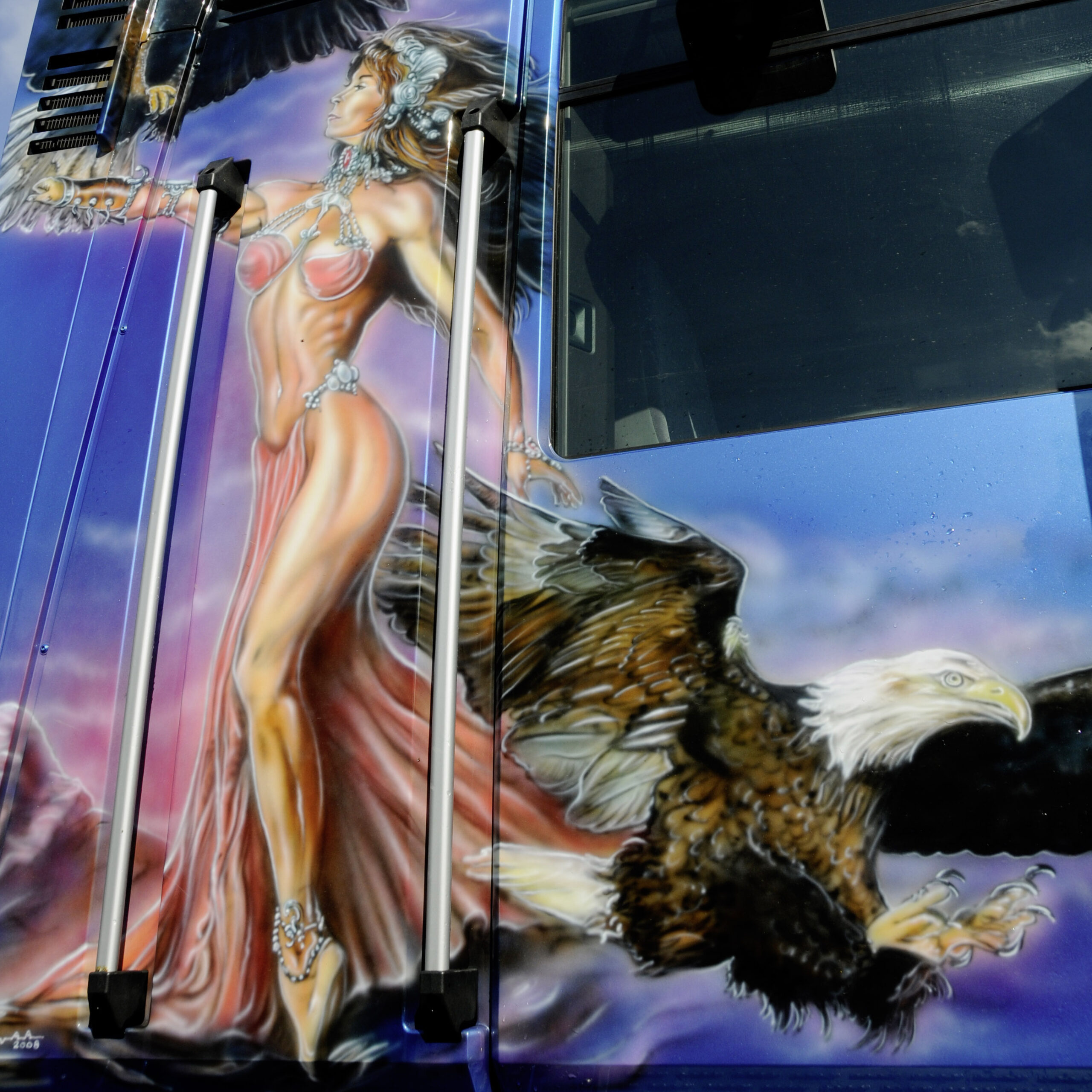 Zijn schoonzoon lacht: “Er hebben al heel wat schoonheden op de wagens gestaan. Meestal naamloze modellen uit een plaatjesboek, maar ook een keer Blondie en Cher.” Verder prijkten er zeemeerminnen, roofvogels en tijgers op de dikke Renaults. Al het airbrushwerk is altijd in overleg met Wil van der Ouderaa gedaan. De cabine van een Magnum is volgens de mannen niet echt gemakkelijk te beschilderen. Harold: “Dat komt door de lange handrails op de zijkant. Daar moet je echt rekening mee houden, want je wilt natuurlijk niet dat het halve gezicht van Shakira er achter wegvalt.”