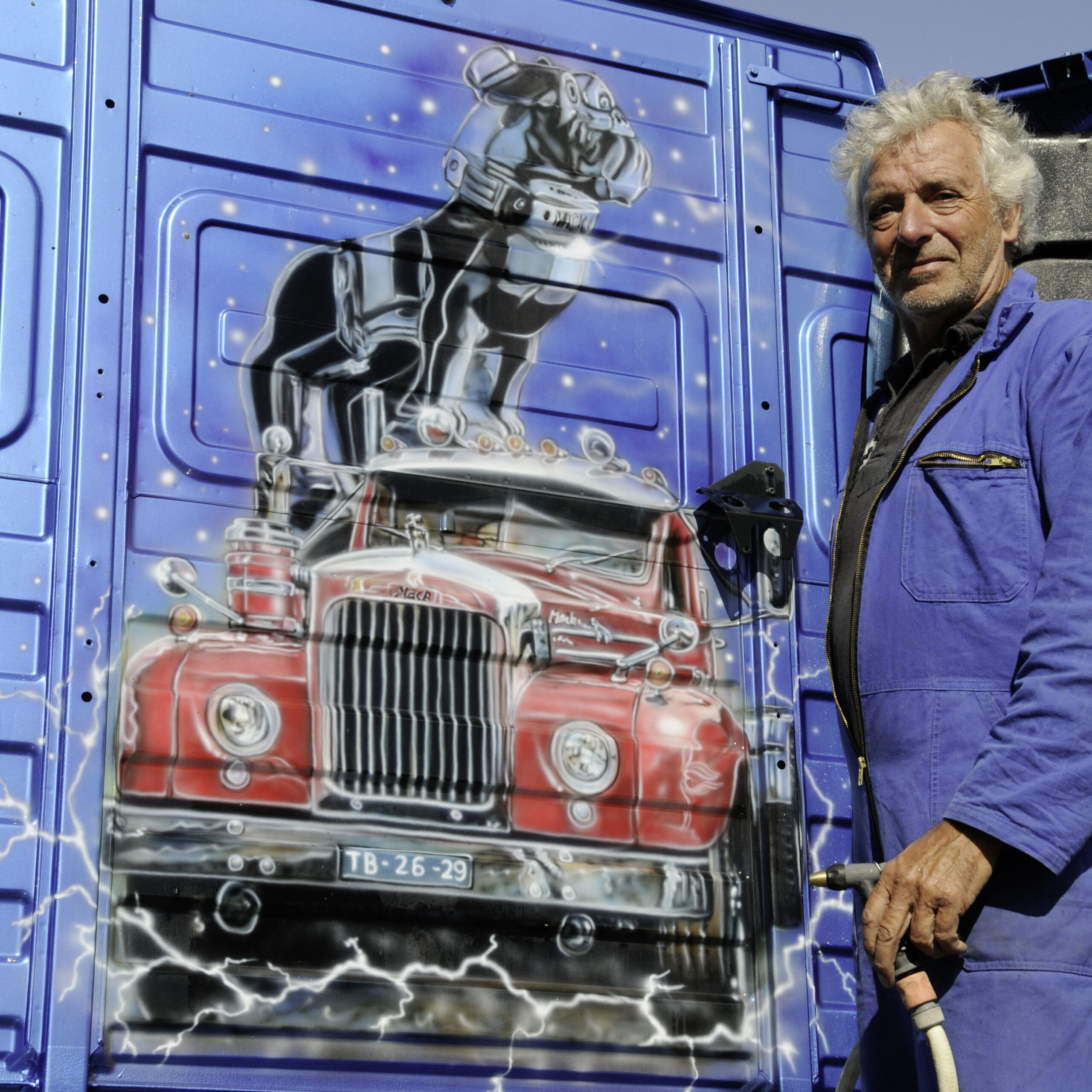 - Harold zorgt goed voor het airbrush-werk op de trucks.