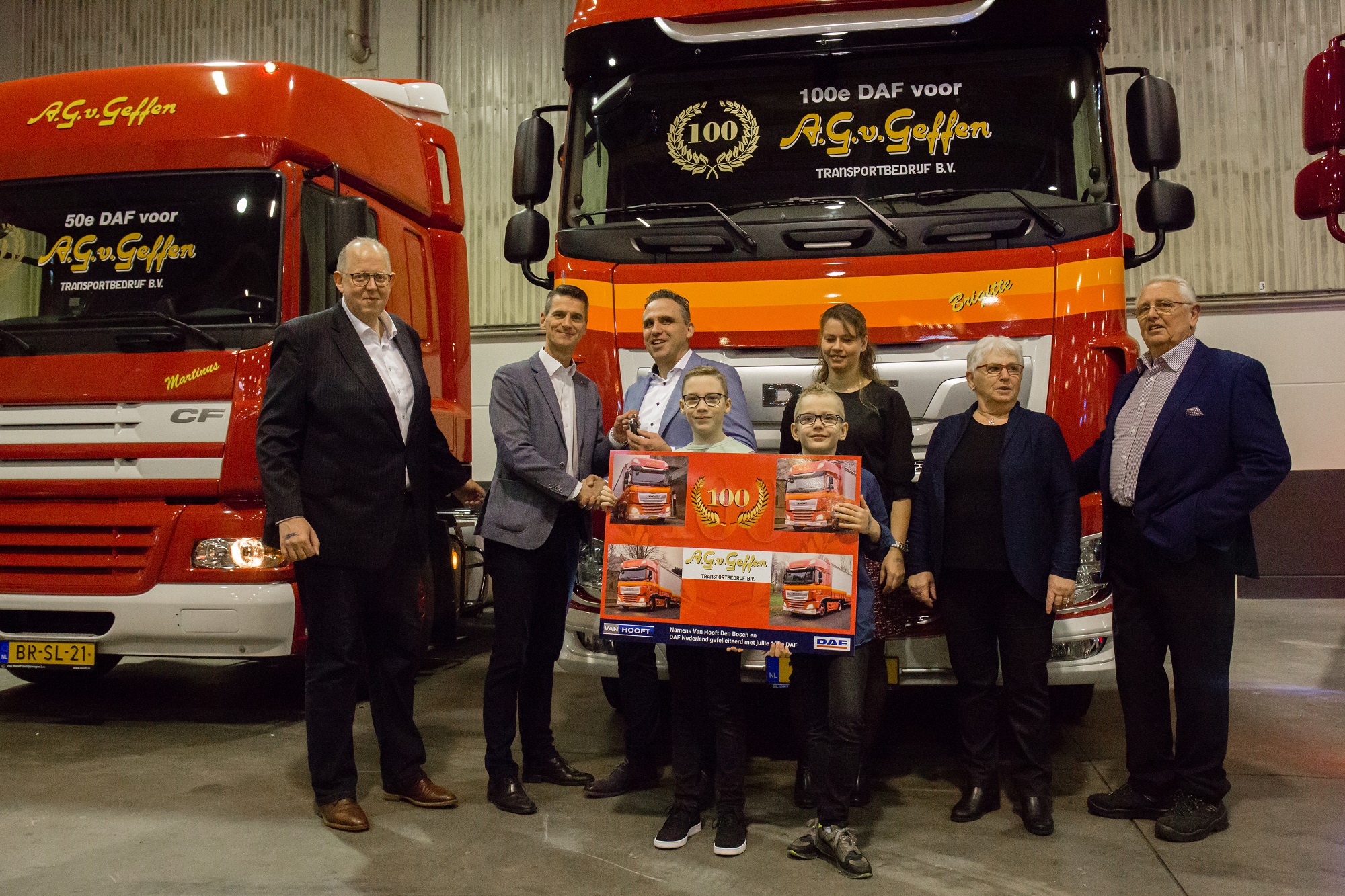 De hele familie Van Geffen was aanwezig bij de overhandiging van de 100ste DAF tijdens het Mega Trucks Festival. Die 100ste is een rijk uitgeruste XF 450 FT 4×2-trekker met Super Space Cab en zijskirts. De truck werd geleverd door Van Hooft Bedrijfswagen B.V. in ’s-Hertogenbosch. DAF speelt al tientallen jaren een hoofdrol bij A.G. van Geffen Transportbedrijf B.V.: de vloot bestaat voor 90% uit trucks van dit merk. “Vanwege gunstige kosten en goede service hebben we DAF al jaren”, aldus directeur Arjan van Geffen. “En de nieuwe CF en XF zijn nog zuiniger. Deze maand zien we verbruikscijfers van rond de 26 liter op 100 kilometer en dat bij lage temperaturen. In de zomer met warmere omstandigheden en minder files is het nog lager.”