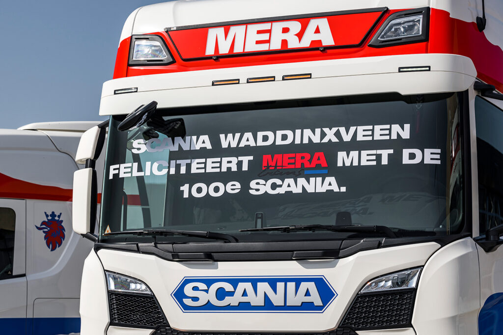 Mera Trans uit Waddinxveen nam recent zijn 100ste Scania in gebruik. Op zich zelf is dat al een mijlpaal. Maar bij Mera heeft die nog een extra glans omdat het bedrijf pas 16 jaar bestaat.