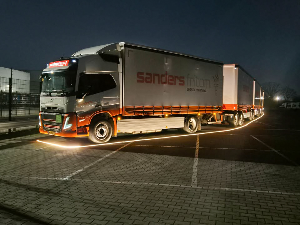 Chauffeurs bouwden een indrukwekkende road train met een totale lengte van maar liefst 114 meter, bestaande uit meerdere gekoppelde trailers. Voorop reed een relatief bescheiden Volvo FM, die hard moest werken om al die trailers te trekken. De lange combinatie zorgde voor een opvallend en feestelijk beeld op het bedrijfsterrein en trok veel belangstelling van collega’s en bezoekers. Een flinke lichtslang verlicht de road train in het donker.