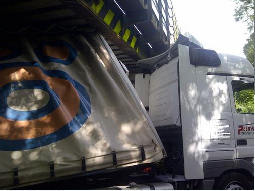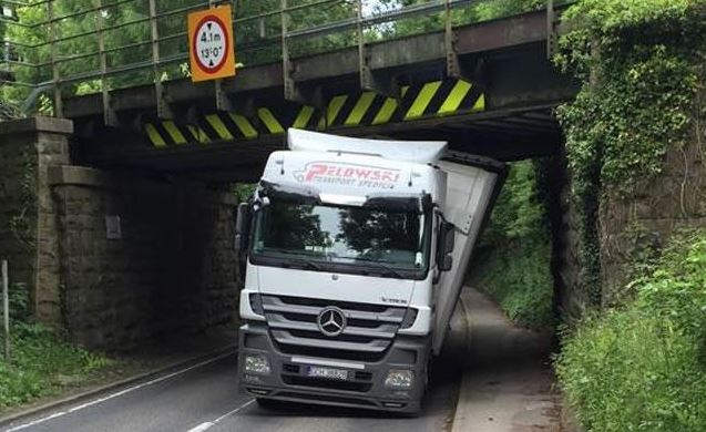 Ergens klopt er iets niet. Dertien voet is omgerekend namelijk 3,96 meter. De trailer kwam onherroepelijk vast te zitten onder het spoorwegviaduct en raakte flink beschadigd.