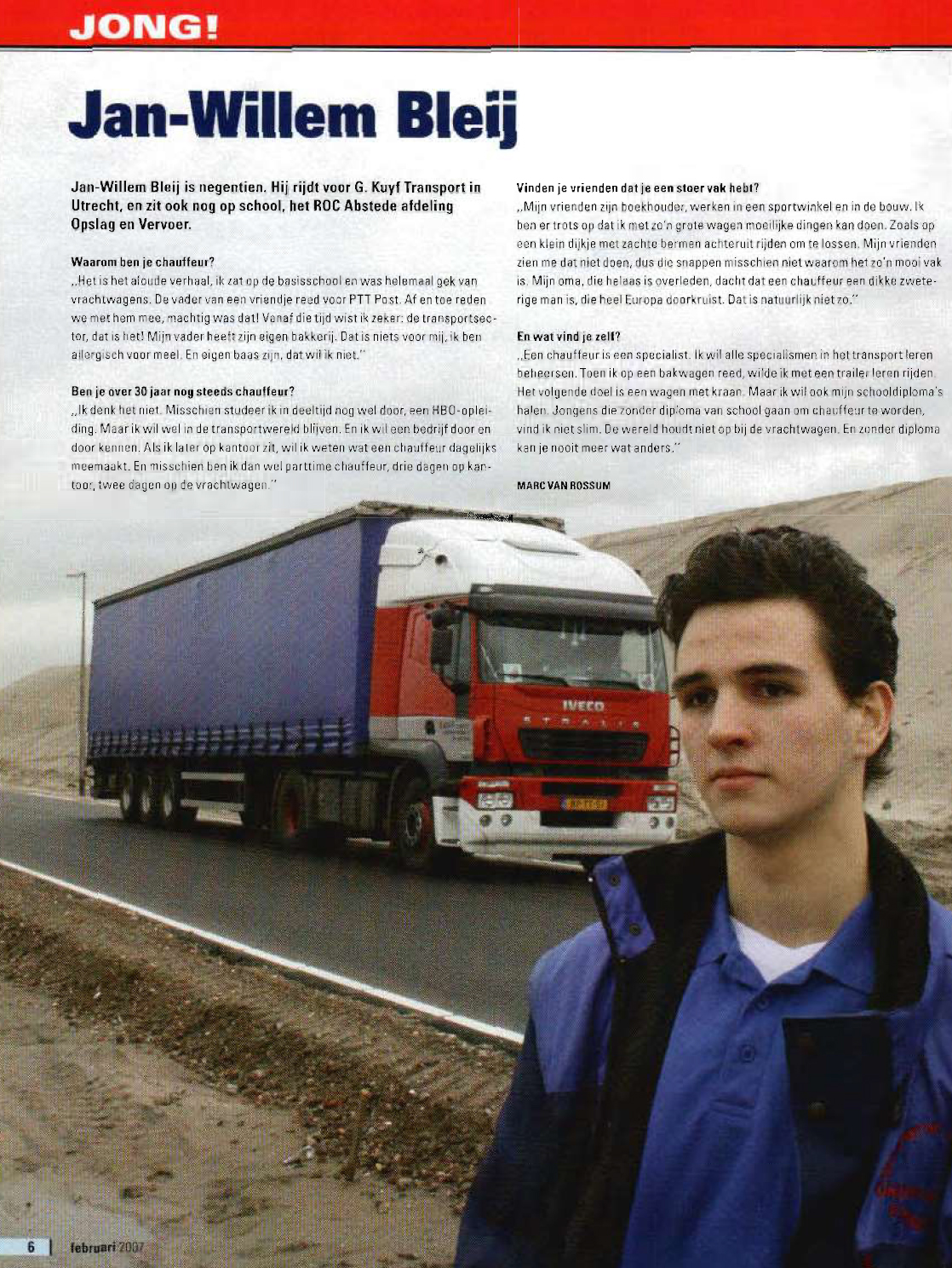 „Ik vind alle interviews leuk, omdat jongeren enthousiast zijn en niet zeuren. Wat ik lastig vind, is dat vaders van veel jonge chauffeurs ook op de vrachtwagen zitten. Vaak vertellen chauffeurs dat ze vanaf jongs af aan met hun vader meereden. Dat kan ik niet elke keer opschrijven, want dan wordt het saai. Niet iedereen snapt dat. Toch maak ik vooral leuke dingen mee. Zo was ik vorig jaar op pad met een jonge chauffeur. Vooraf vraag ik of ze vast een plekje kunnen bedenken waar we foto’s kunnen maken. Dat kost al snel twintig minuten. Deze chauffeur zette zijn truck midden op een kruising stil. ‘Hier rijdt niemand’, zei hij. Het ging precies dertig seconden goed, toen de eerste auto voorbij wilde. En de auto’s bleven maar komen. Toen hebben we maar een ander plekje opgezocht. Ook dat werd weer een mooie foto.”