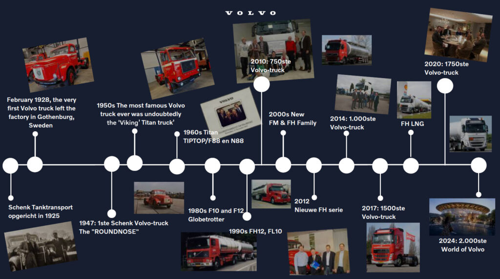 Al ruim 77 jaar levert Volvo Trucks vrachtauto’s aan Schenk. Het familiebedrijf, dat in 1925 begon met de handel in zand en grind, nam in 1947 met de zogenoemde ‘Rondneus’ de eerste Volvo in gebruik. In de late jaren ’50 van de vorige eeuw werd de eerste tankwagen aangeschaft, waarmee de basis werd gelegd voor het huidige tanktransportbedrijf. Door de jaren heen heeft het verschillende Volvo-truckmodellen in de vloot gehad, waaronder de N88 met de iconische Titan-cabine in de jaren ‘60, gevolgd door de F88, F10 en F12 en vanaf de introductie in 1993 de verschillende generaties van de Volvo FH.
