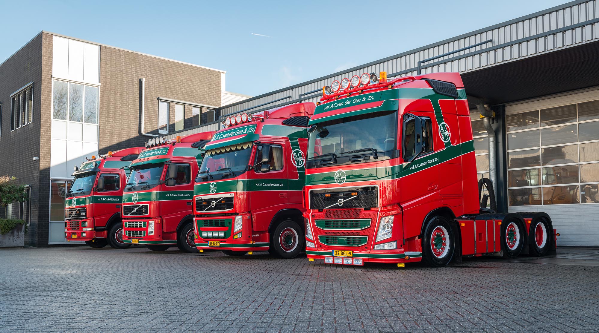 De levering van een nieuwe Volvo FH bij A.C. van der Gun & Zn uit Harmelen leverde een bijzonder plaatje op: vier generaties Volvo FH.