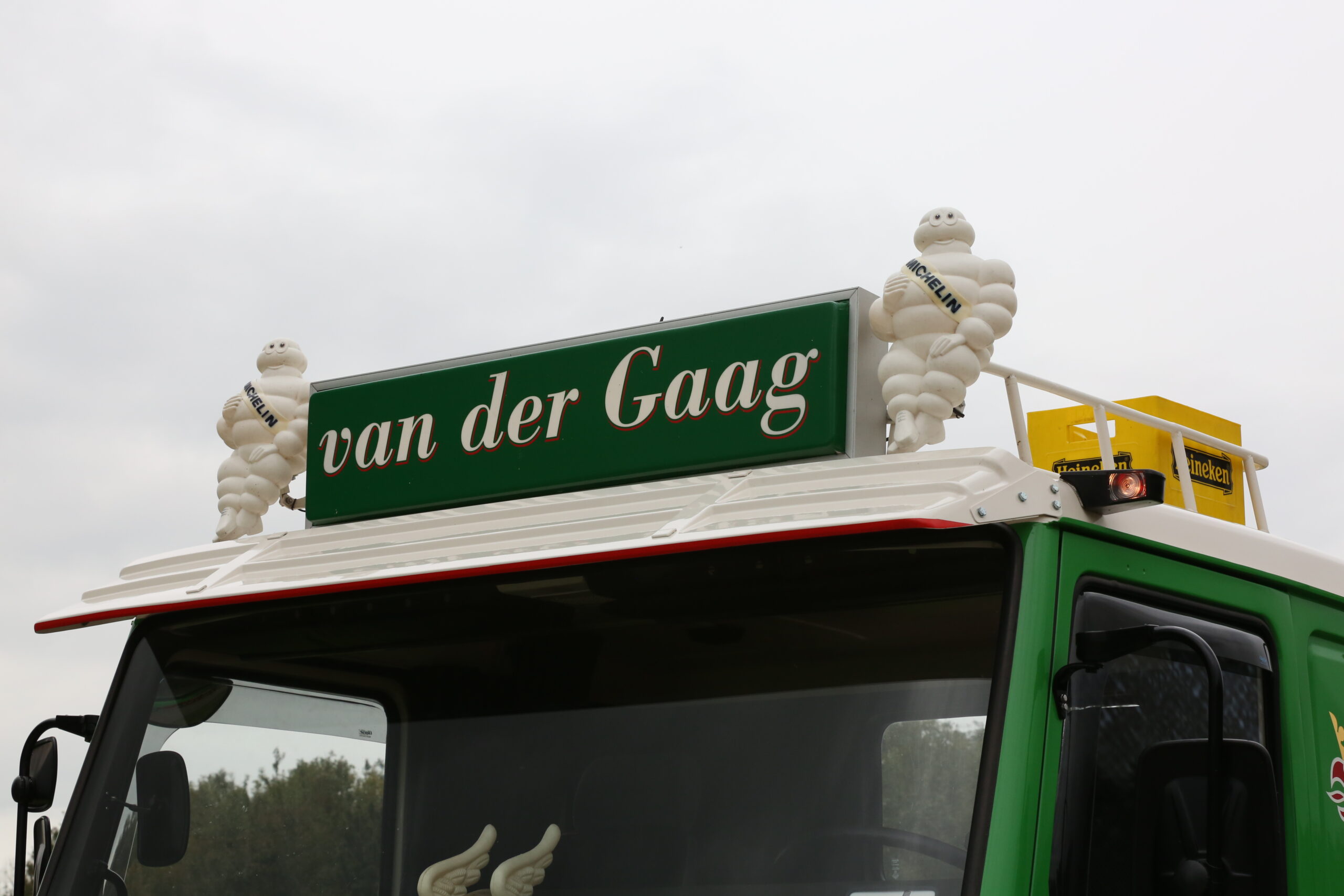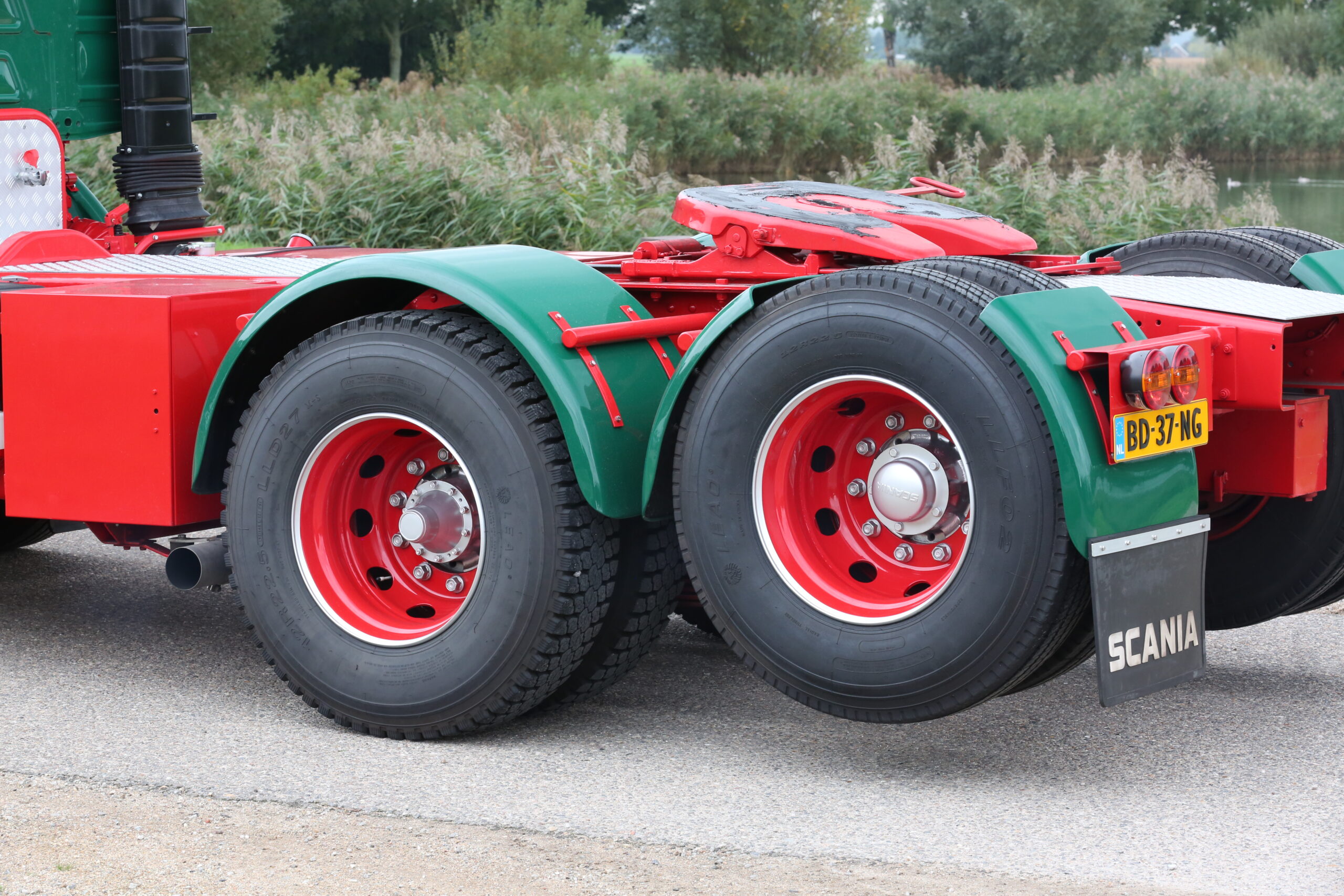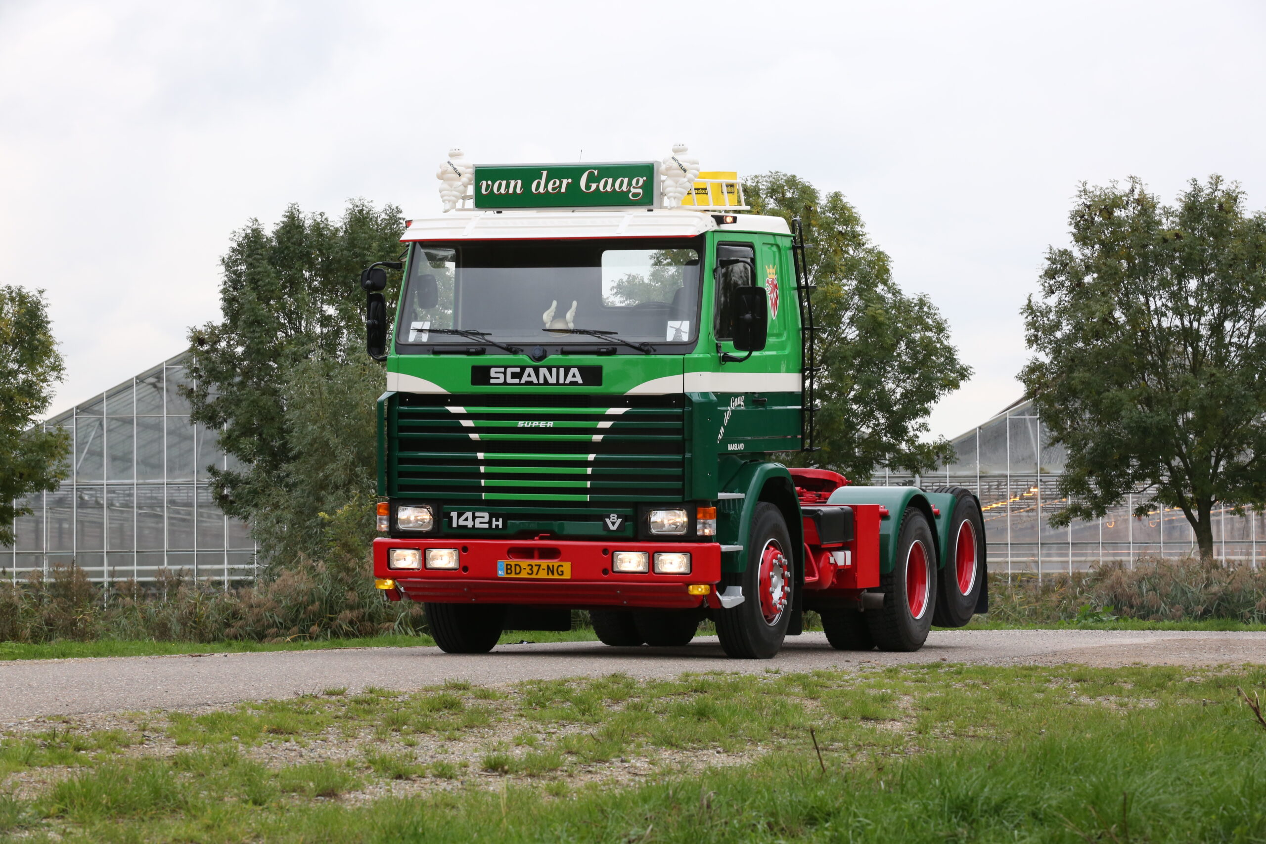 De lucht is wat grauw op deze herfstige fotodag maar de fraaie kleuren van de Scania 142H van Van der Gaag steken toch lekker af tegen de grijze achtergrond. Daarvoor zorgen niet alleen de twee tinten groen op de cabine maar vooral het rood van de bumper, de wielen en het chassis. De kleurcombinatie siert alle klassieke trucks van Jos van der Gaag. De familie gebruikt deze combinatie overigens al heel lang: al toen opa Van der Gaag met transport van de eigen goederen begon, hadden de trucks deze kleuren. In de loop van de tijd werd er weleens wat gemoderniseerd maar de basis bleef. Het past in ieder geval erg goed bij de klassiekers. Als je er tussen staat, waan je je gewoon 30, 40 of misschien wel 50 jaar terug in de tijd.