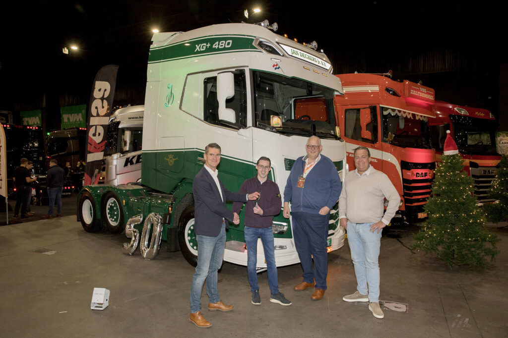 De officiële overhandiging van de jubileumtruck voltrok zich op zaterdag 7 december jongstleden tijdens het Mega Trucks Festival in de Brabanthallen. Een feestelijke mijlpaal voor het transportbedrijf uit Ammerzoden dat al meer dan dertig jaar DAF in zijn wagenpark heeft. Directeur-eigenaar Jan Deckers: “We hebben nu veertig trekkende eenheden, waarvan dertig van het merk DAF. We zijn content met het merk en met de service van de dealer. Het moment van aanschaf is maar kort. De toegevoegde waarde van de service vinden we veel belangrijker en die is goed. Daardoor heeft het merk DAF zo’n groot aandeel in ons wagenpark.”
