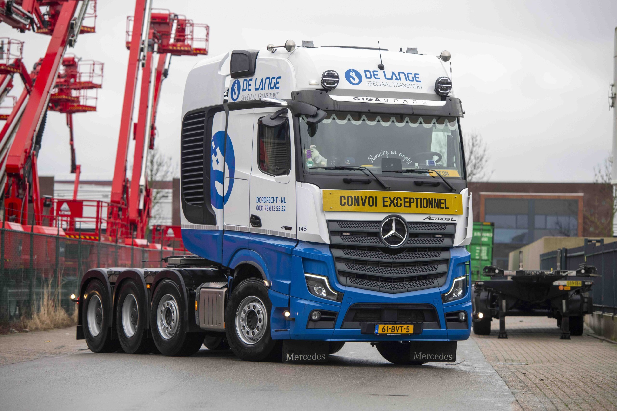 Sander de Lange over de grote bestelling: “Het zijn 5 zeer indrukwekkende trucks die elk op een eigen, onderscheidende manier zijn in te zetten. Zo hebben we 2 maal een Actros 2551 LS VLA 6×2 aangeschaft. Dit zijn 3-assige trucks met voorloopas, voorzien van een schuifschotel en een dubbele plaat koppeling. Op deze trucks hebben we een ontheffing van 72 ton. Ook namen we 2 Actrossen 2548 LLS VLA 6×2 in gebruik. Dit zijn rondom luchtgeveerde Lowliner-voorloopastrekkers: extra laag met een schotelhoogte van 96 cm, en daardoor goed voor volumetransport met hoge ladingen, zoals airco-units. Ze zijn allebei voorzien van een schuif- hefschotel. Het is dus ook mogelijk om hiermee een ‘normale’ trailer mee te nemen. Het mooie is dat alle genoemde speciale voorzieningen direct worden geleverd door Mercedes-Benz. Die hoeven we dus niet los aan te schaffen bij een derde partij.”