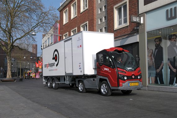 Foto: een voorbeeld van milieuvriendelijke stadsdistributie is de elektrisch aangedreven Cargohopper