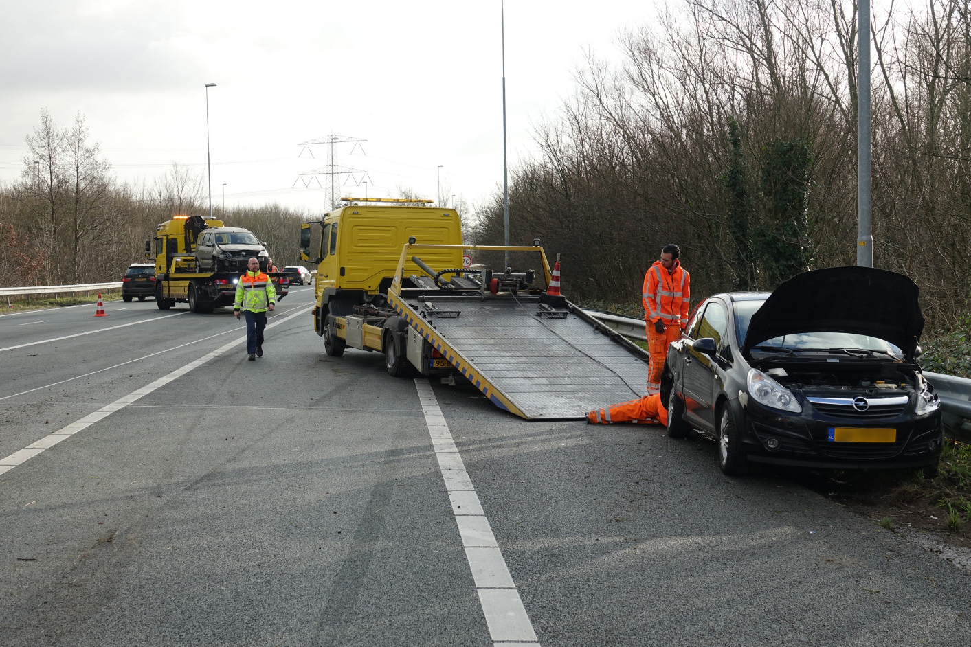 Hicham Benayad en Daan Exalto (liggend) van Hoogwout Berging en weginspecteur Hans op het Knooppunt Zaandam op 18 januari 2020. Foto: SIMN
