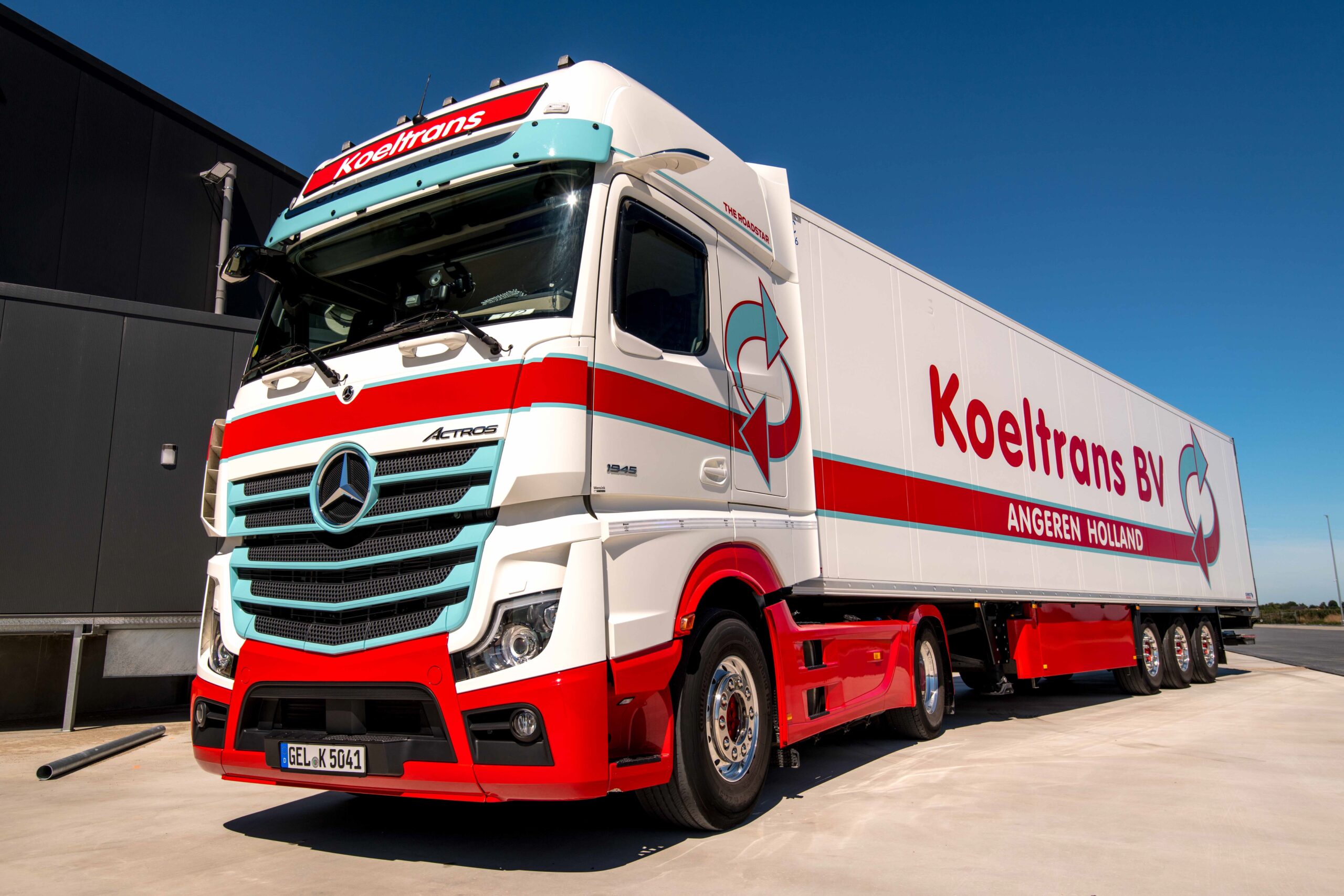 Voor het wagenpark van Koeltrans Angeren hanteert men een tweemerkenbeleid, zo rijdt het transportbedrijf ook met Scania’s. Zowel de Total Cost of Ownership als de uitstraling hebben meegewogen in de keuze voor Mercedes-Benz. De nieuwe anticiperende cruisecontrol Predictive Powertrain Control (PPC) kent nu ook bochtradiussen, rotondes en snelheidslimieten en bespaart hiermee 3 tot 5 procent brandstof.Toch wordt niet alleen cijfermatig naar de Actros gekeken. De grootste cabinevariant, de GigaSpace-cabine, biedt veel comfort voor de chauffeurs. Met onder meer lederen bekleding, luchtgeveerde bestuurders- en bijrijdersstoel, koelkast en standairco is elke Actros van alle gemakken voorzien.