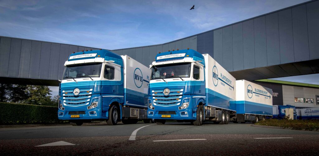 RVE Plantenhandel maakt voor het vervoer van planten en bloemen naar supermarkten in Duitsland gebruik van een gevarieerd wagenpark dat uit meerdere merken bestaat. In relatief korte tijd werden daar twee Mercedes-Benz Actros bakwagens aan toegevoegd. Afgelopen week werd de laatste, een nieuwe Actros 2548 LENA 6×2, in gebruik genomen. De volledig luchtgeveerde bakwagen met gestuurde en hefbare naloopas kreeg de voorkeur vanwege onder meer de innovatieve veiligheidsystemen. Met Active Brake Assist 5 en de MirrorCam is de standaard veiligheid hoog.