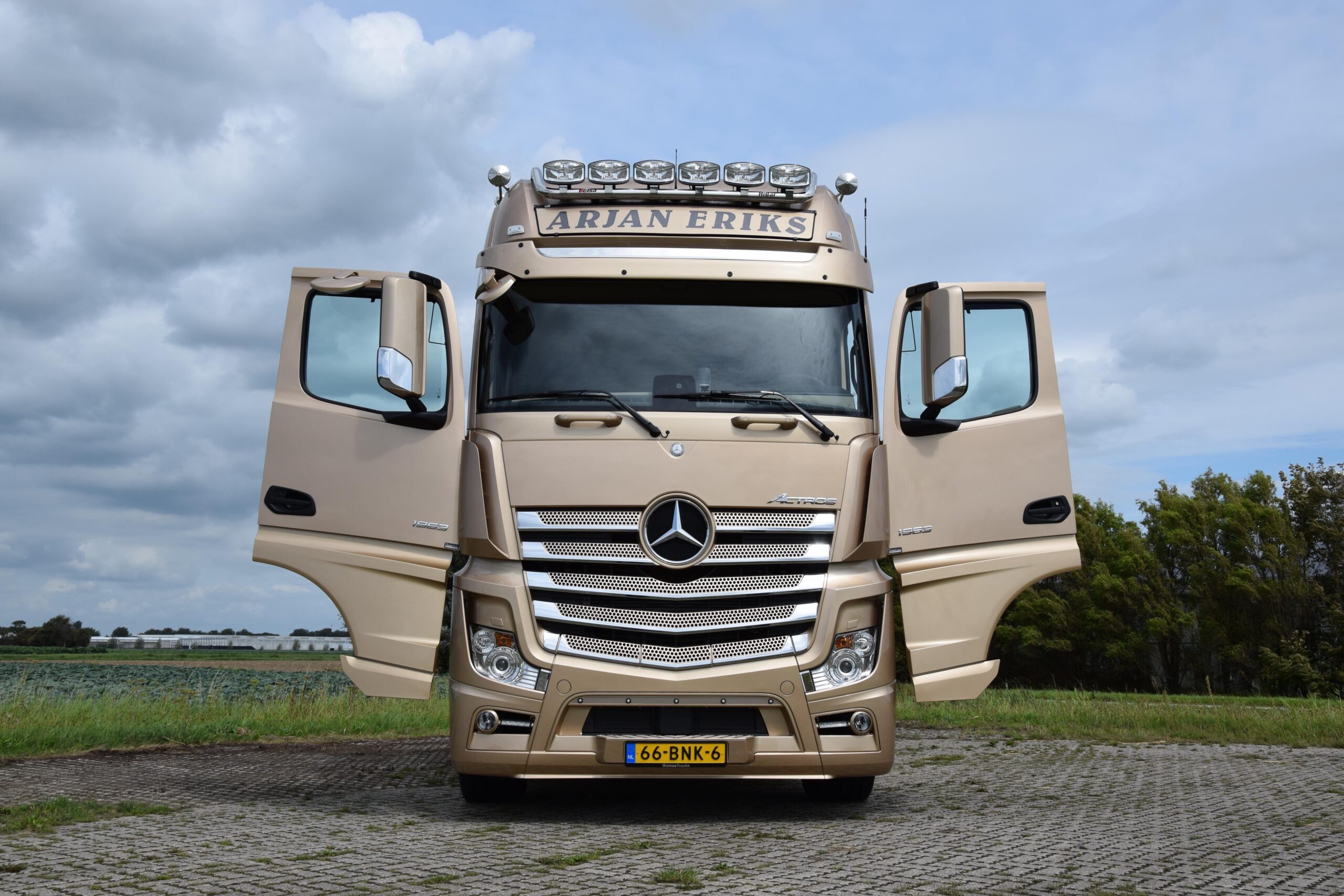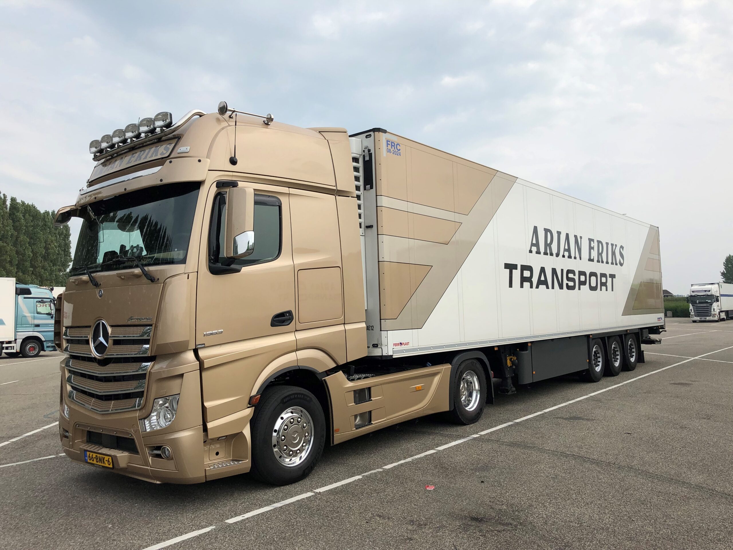 Mercedes-Benz truckdealer Gomes Noord-Holland heeft deze dertiende ster van het wagenpark geleverd. De aangeschafte Mercedes-Benz Actros 1863 LS is een speciaal actiemodel van Gomes Noord-Holland. Deze speciale Gomes Rising Star Edition springt direct in het oog door zijn champagne-kleurige metallic lak, waarmee het de enige truck in het wagenpark van Arjan Eriks Transport is zonder de kenmerkende groen-witte kleurstelling. De riante GigaSpace-cabine is van alle gemakken voorzien. “Onze chauffeurs zijn soms de hele week van huis voor transport door heel Europa”, vertelt directeur Arjan Eriks. “Wij vinden het belangrijk dat zij een comfortabele werkplek hebben, waar zij bovendien kunnen ontspannen.”