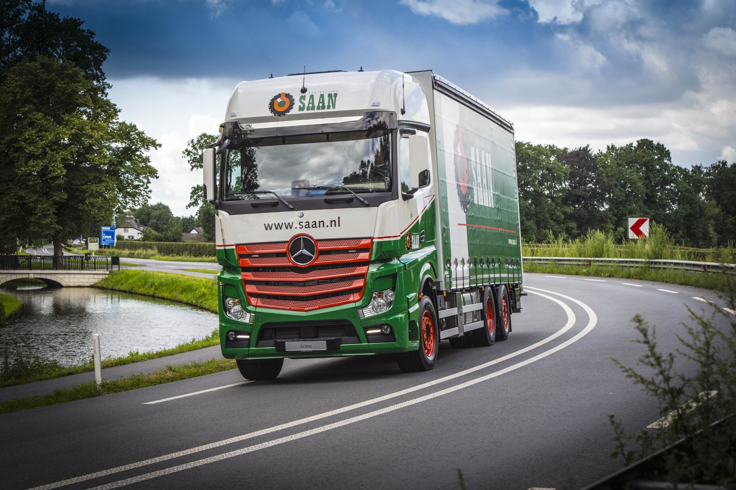Hertoghs Carrosserieën heeft de auto voorzien van een 7,5 meter lange schuifzeilcarrosserie met een schuifdak dat zowel voor als achter te openen is. De Dhollandia laadklep heeft een hefvermogen van 10 ton. Dat maakt de Actros volgens Saan prima geschikt voor het vervoer van delicate objecten, zoals MRI-scanners. Ondanks zijn grote hefvermogen, heeft de laadklep een relatief slanke constructie, die gestabiliseerd wordt door een set hydraulische steunpoten. Inmiddels heeft Mercedes truckdealer Stern de auto bij Saan in Diemen afgeleverd.