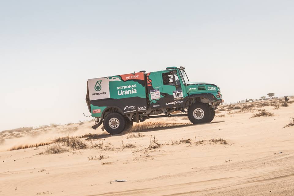 Op de overwegend snelle stukken, afgewisseld met de keiharde bulten kamelengras, reed De Rooy een band bijna kapot. ,,Het loopvlak. We hebben ‘m voor de zekerheid gewisseld voordat ie echt kapot ging”, vertelt hij in het bivak. ,,Dat betekent dat ik voor morgen nog anderhalve band heb.” De zevende etappe was het eerste deel van de marathonetappe. De Rooy moest zijn Iveco Powerstar in een parc fermé zetten waar de monteurs van het assistentieteam er niet aan mogen komen. Met de reservebanden waarmee hij begon aan de zevende etappe, moet hij ook het eind van de achtste zien te halen.