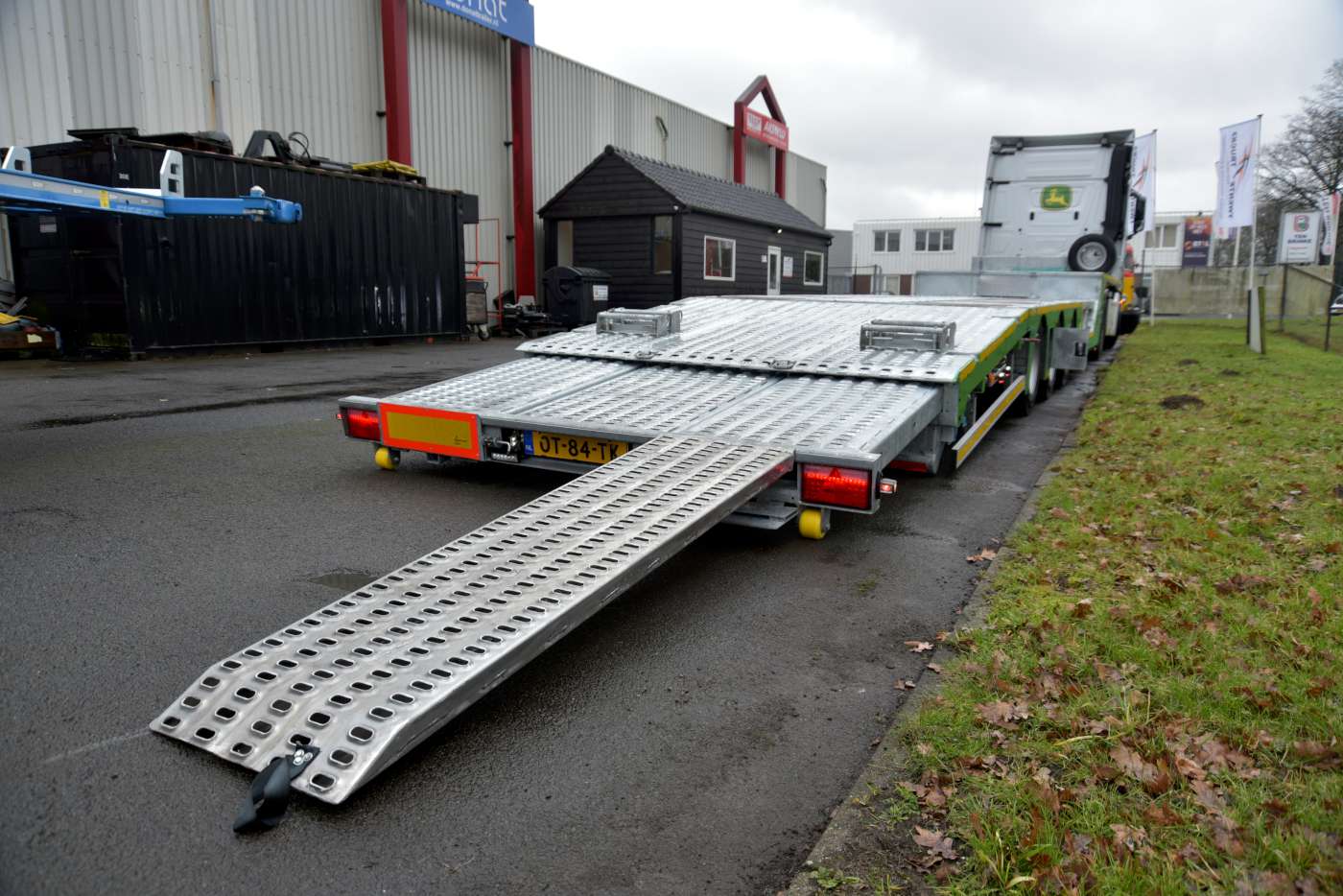 De semi- dieplader is aan de achterzijde scharnierbaar uitgevoerd waardoor de oprijhoek minimaal is. De achterzijde is tevens 1,5 meter hydraulisch uitschuifbaar. In de achterzijde zijn achter slimme luiken maar liefst vier oprijplaten opgeborgen. Twee voor aan de achterzijde en twee om op de nek te kunnen rijden. Verder is de oplegger uitgerust met een groot aantal sjorogen.