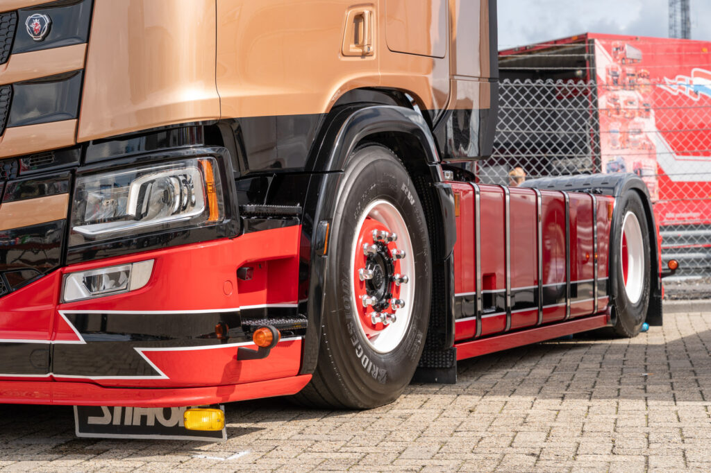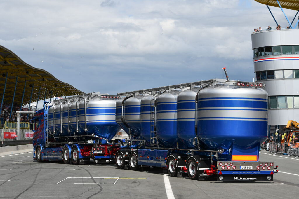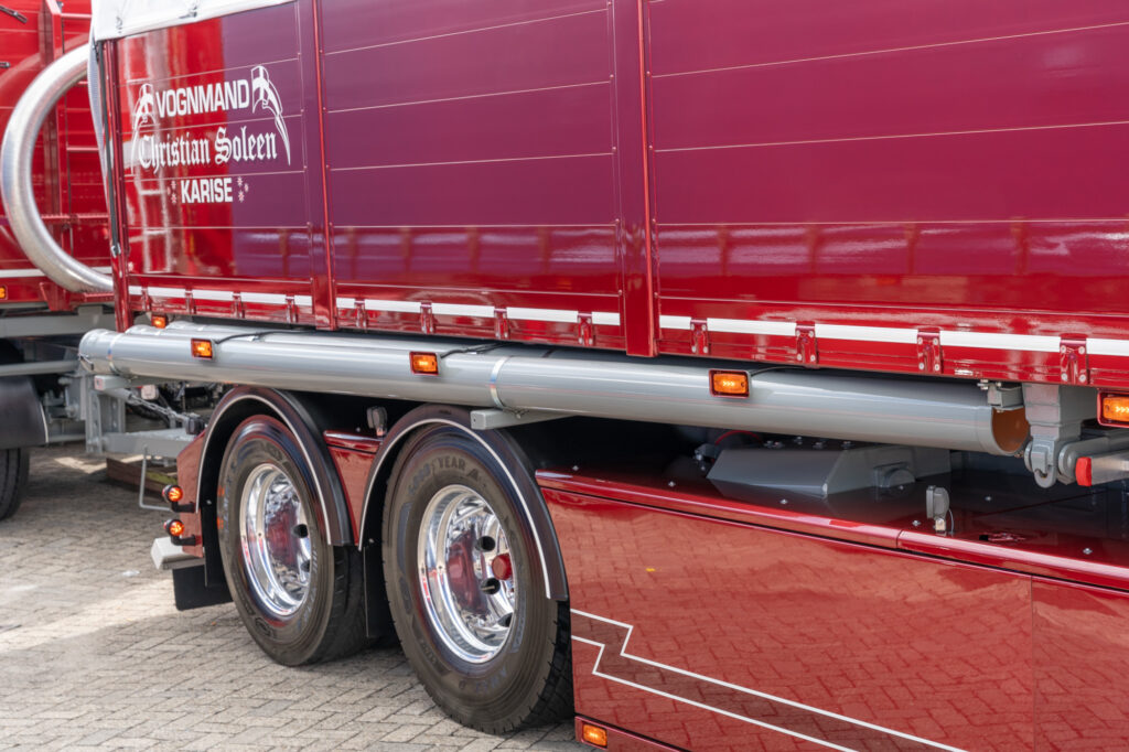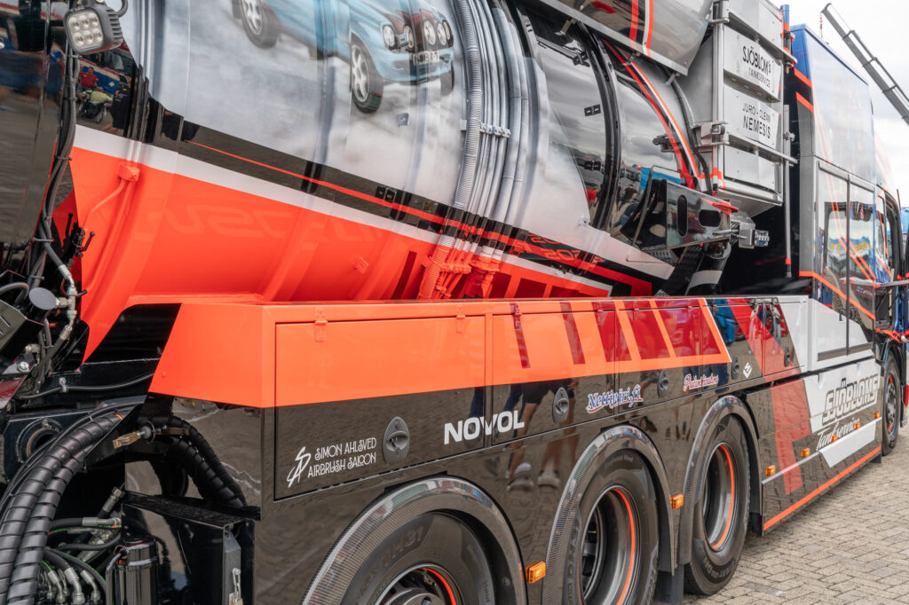 Een van de langste trucks op het terrein dit weekend is deze Scania bulktruck, een verschijning die we in Nederland niet vaak tegenkomen. Met zijn unieke opbouw en glanzende details is hij onmogelijk te missen.