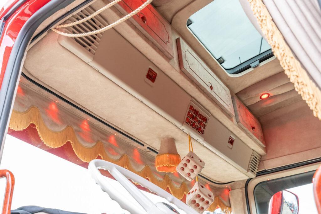 Dit helderwitte interieur is een echte blikvanger. Het is gedurfd, maar past prachtig bij de buitenkant van de Scania. Het is een eerbetoon aan de legendarische Scania 143, wat je zelfs terugziet op de achterwand. De klassieke versnellingspook van een 143 bedient nu de luchthoorns.