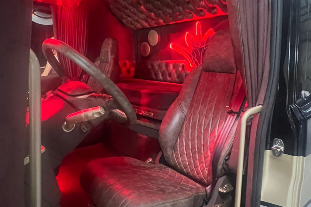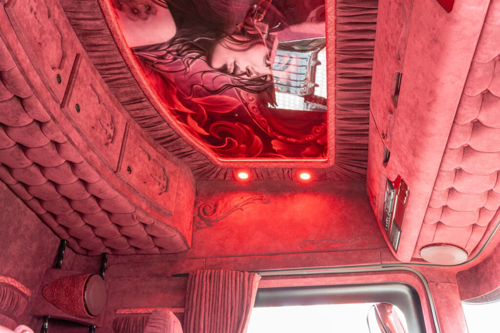 Dit interieur is een eerbetoon aan een legende van het bedrijf. De oude Scania van dit bedrijf staat dit jaar weer op het showplein, en het interieur is een eerbetoon aan “The Don”.