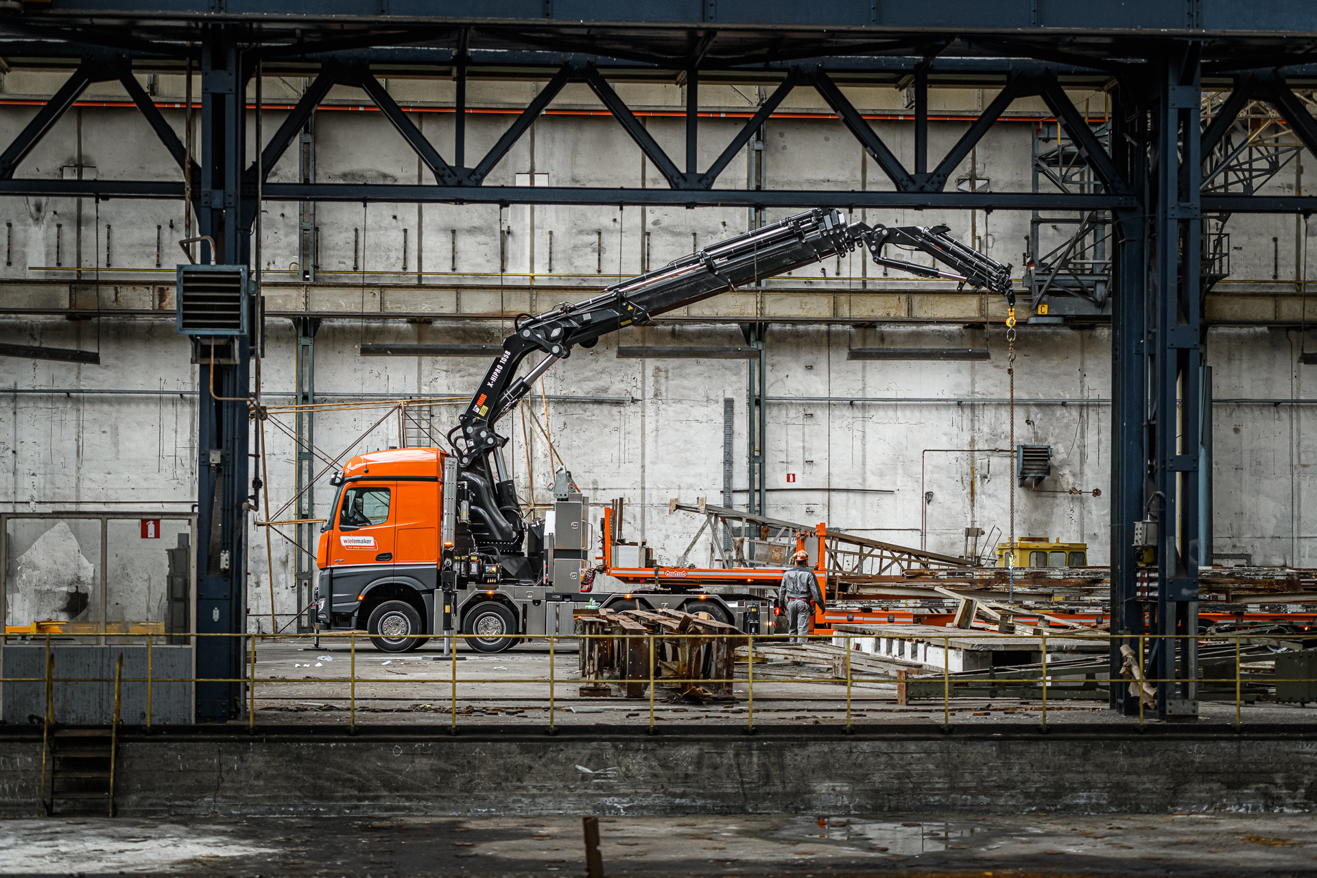 De nieuwe Arocs 3751 is afgeleverd als L 8×4 bakwagen chassis en in Molsheim voorzien van speciale voorbereidingen voor o.a. de laadkraan. CCH Carrosserieën in Halsteren bouwde een Hiab X-Hipro 1058 laadkraan op het voertuig die zes keer uitschuifbaar is, met een JIB die ook nog eens vijf keer uitschuifbaar is. Dat resulteert in een 105 ton/meter kraan met een reikwijdte van bijna 25 meter. Tevens is er een complete RVS kastenwand achter de laadkraan geplaatst die kan worden opgepakt en verwijderd indien nodig. Op verzoek heeft deze Arocs een additioneel innerliner chassis gekregen waardoor er een zware steunpoot aan de voorzijde kan worden bevestigd. Deze zorgt niet alleen voor meer stabiliteit bij kraanwerkzaamheden, maar ook dat de kraan voor de cabine een zware lading kan optillen.
