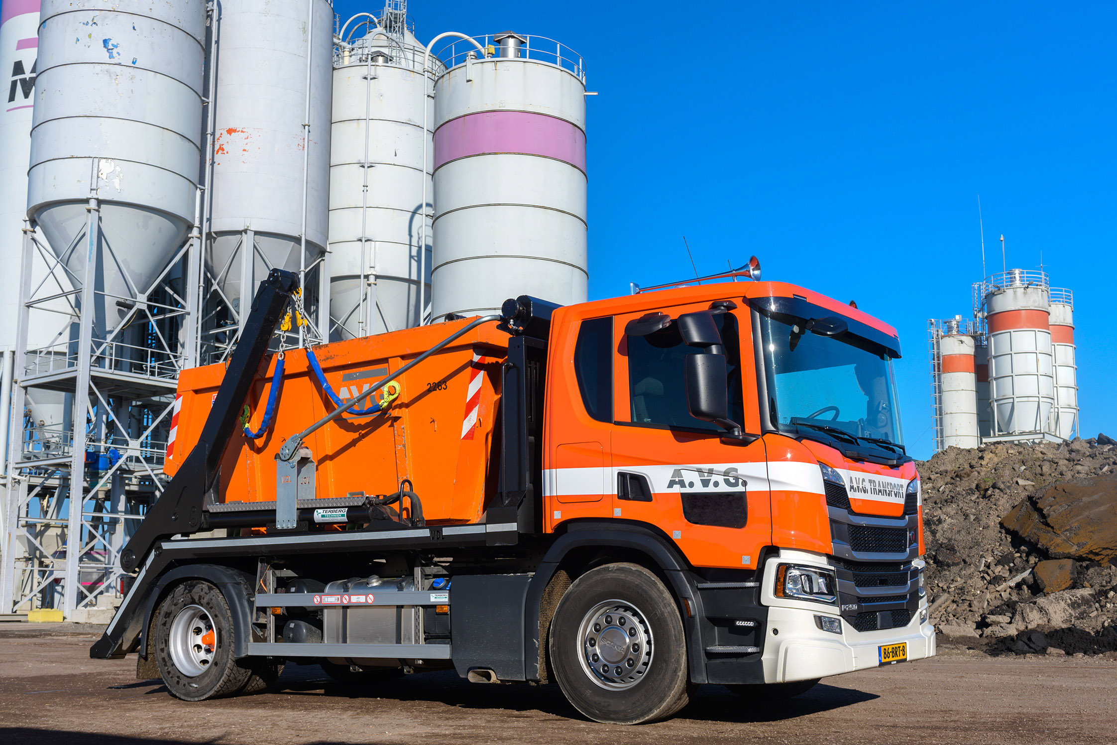 AVG biedt met vier divisies een zeer divers dienstenpakket aan. De 230 medewerkers werken voor Infra, Bouwstoffen, Transport en Explosieven Opsporing. AVG Bouwstoffen, waar de nieuwe Scania voor rijdt, is leverancier van bouw- en grondstofmaterieel en beschikt over verschillende soorten containers voor het afvoeren van afval. Het bedrijf is opgericht in 1920 en is sinds 1988 ook actief op de Duitse markt.