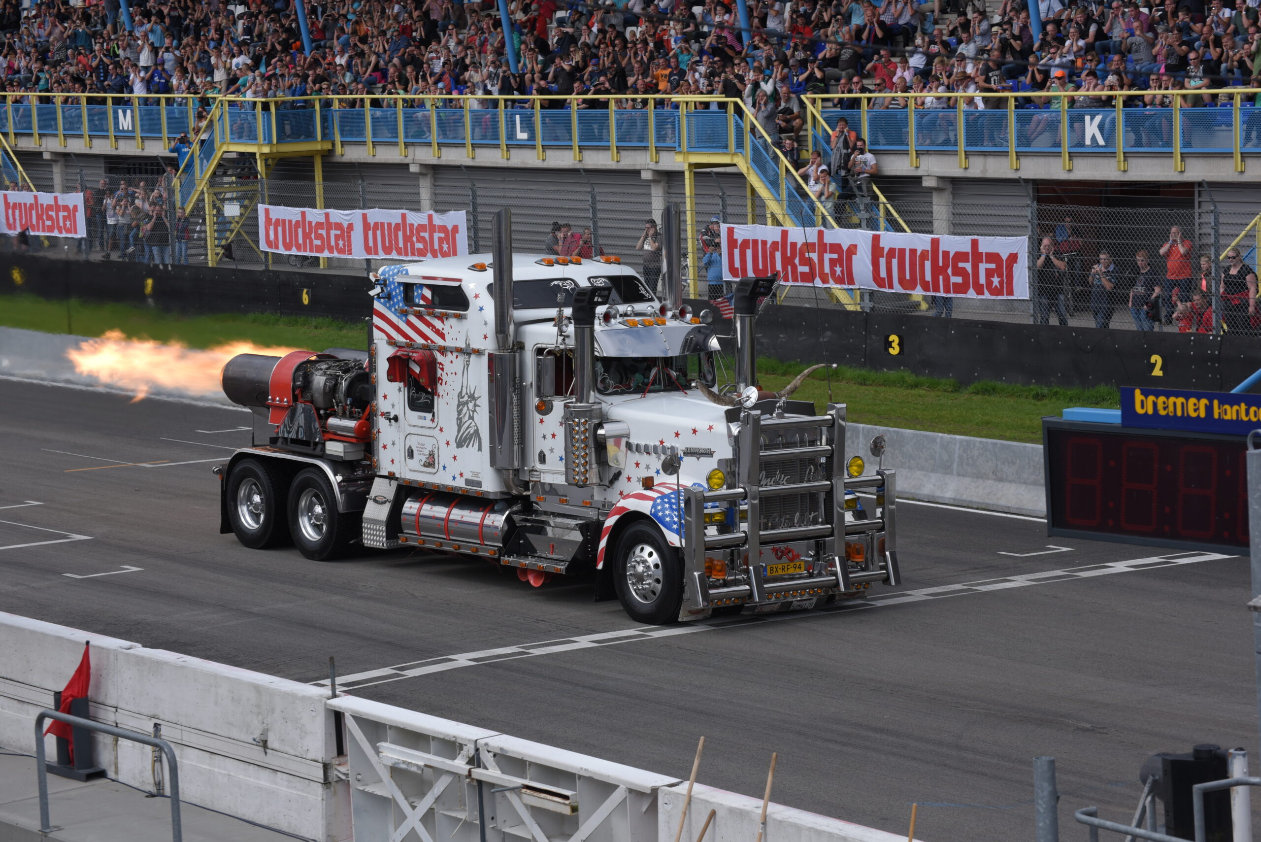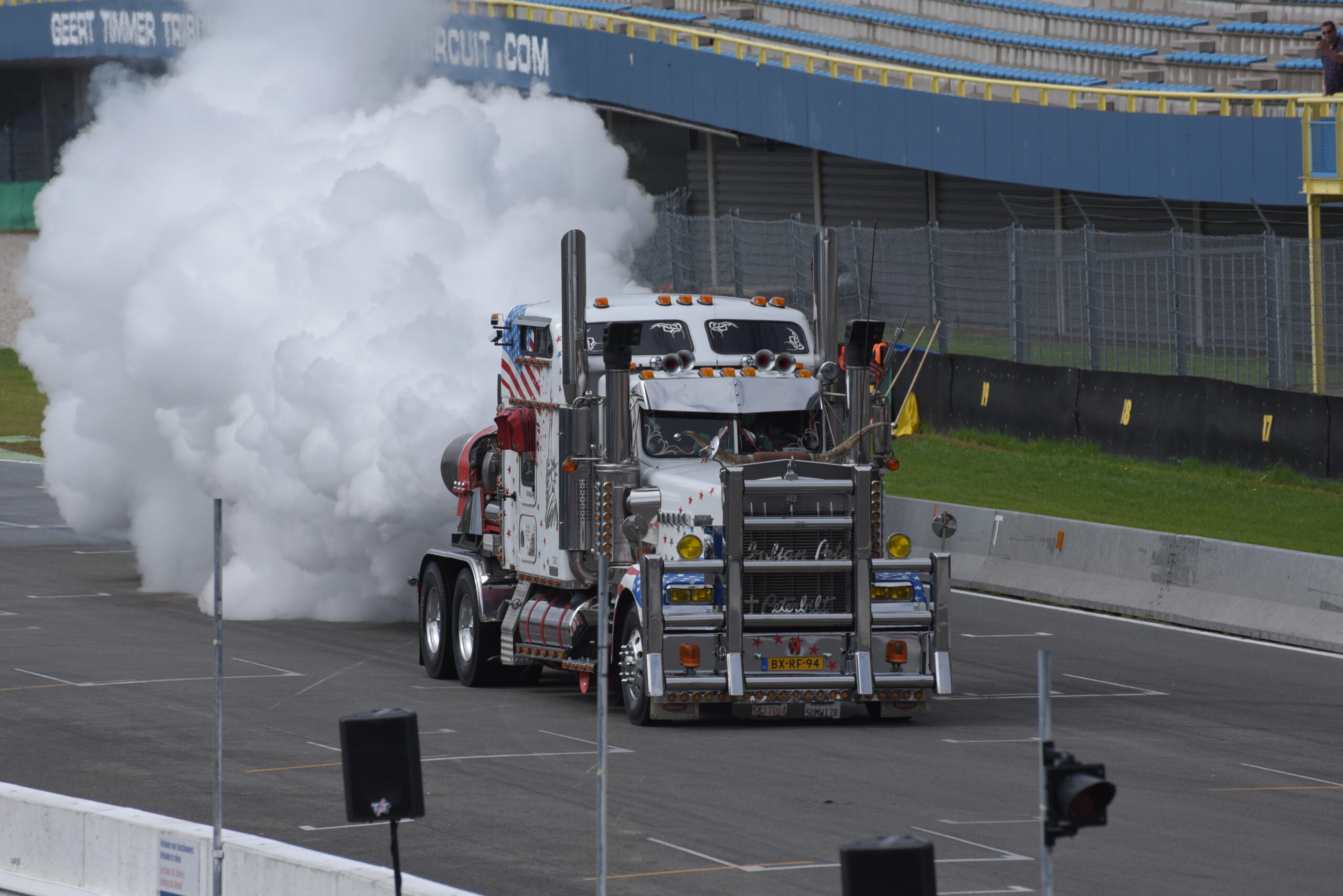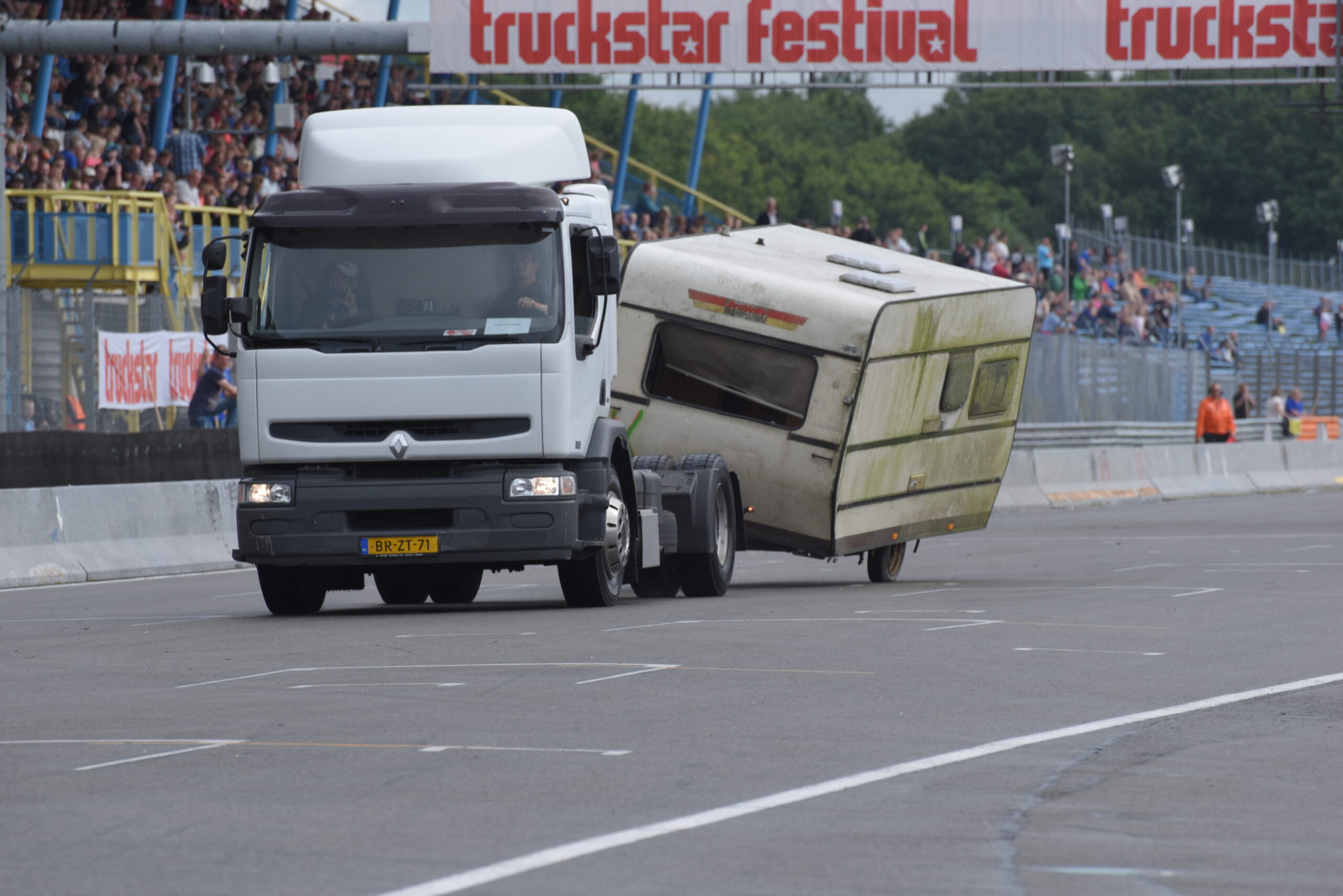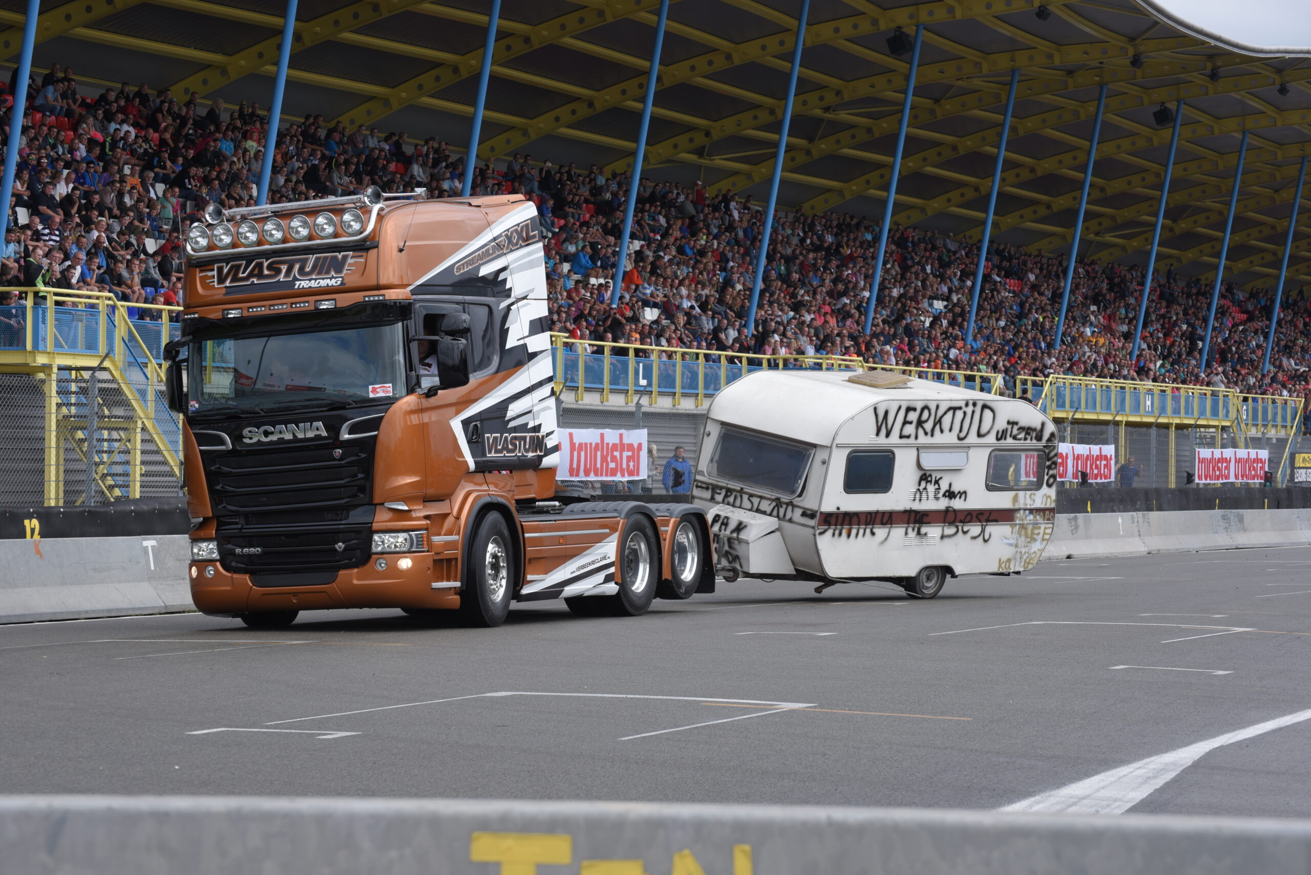Vind je het heerlijk om op de tribune naar spectaculaire shows te kijken? Dan ben je op het Truckstar Festival aan het juiste adres! Ook dit jaar is er weer een afwisselend baanprogramma dat inmiddels in volle gang is! Zo gaven de racetrucks vanochtend bij aanvang acte de presence en werden rond de klok van elf uur weer heel wat caravans platgelegd. Indian Pete – je weet wel, die Indiaan met die dikke Amerikaanse truck – liet zijn bijzonder uitgedoste Kenworth W900 brullen voor de hoofdtribune en daarna vond de voorronde van de Decibellencontest plaats. Willy Oosterhuis – Loat Goan!! – voorziet ook dit jaar de activiteiten van verrijkend en diepzinnig commentaar en dat staat garant voor veel vertier.