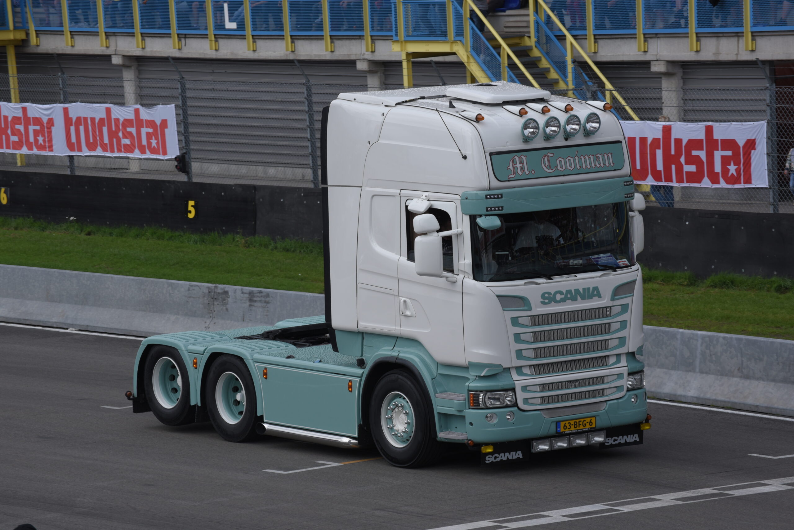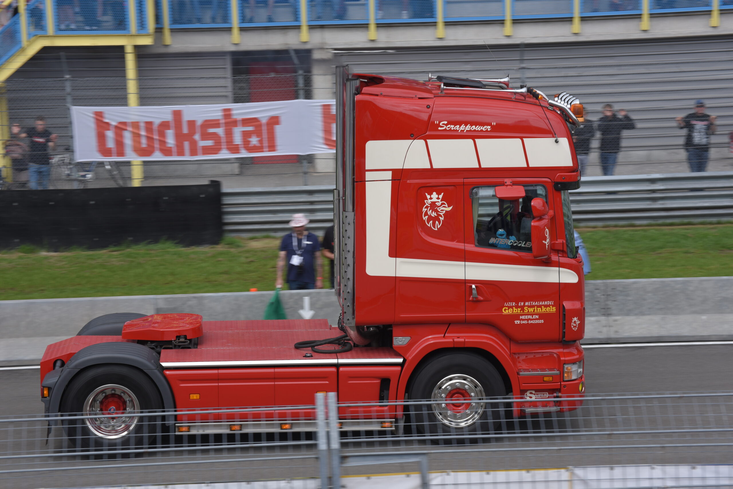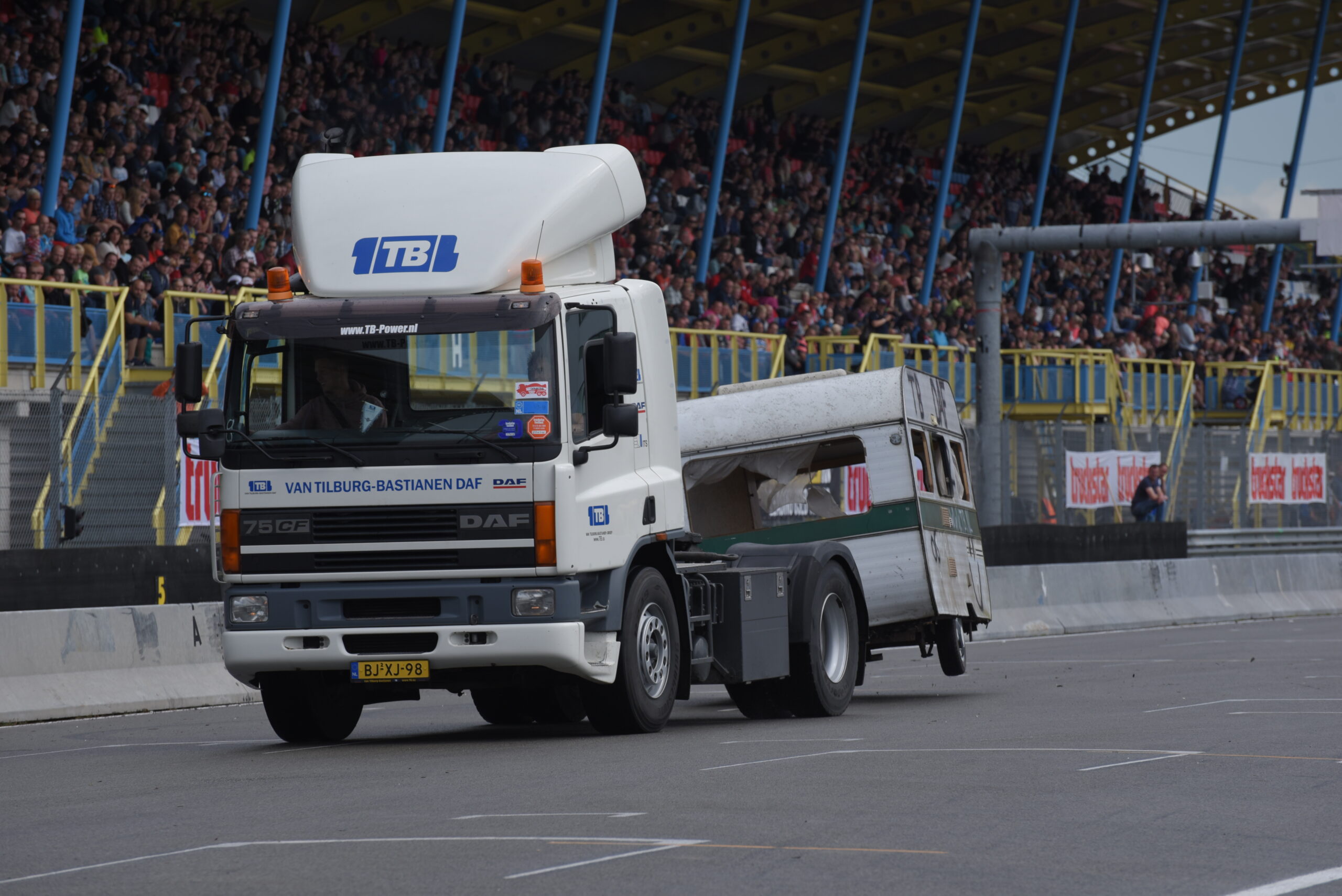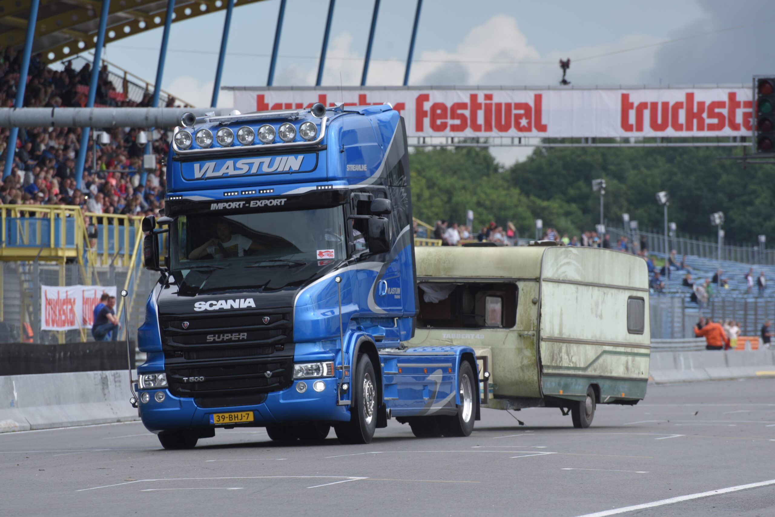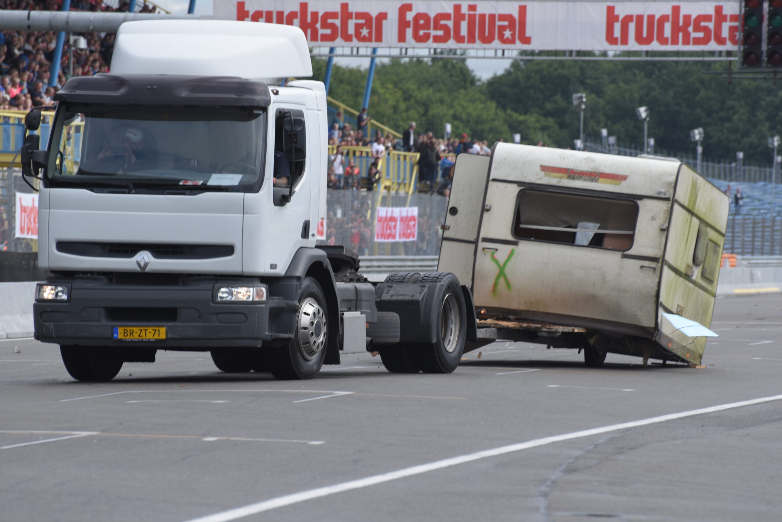Vind je het heerlijk om op de tribune naar spectaculaire shows te kijken? Dan ben je op het Truckstar Festival aan het juiste adres! Ook dit jaar is er weer een afwisselend baanprogramma dat inmiddels in volle gang is! Zo gaven de racetrucks vanochtend bij aanvang acte de presence en werden rond de klok van elf uur weer heel wat caravans platgelegd. Indian Pete – je weet wel, die Indiaan met die dikke Amerikaanse truck – liet zijn bijzonder uitgedoste Kenworth W900 brullen voor de hoofdtribune en daarna vond de voorronde van de Decibellencontest plaats. Willy Oosterhuis – Loat Goan!! – voorziet ook dit jaar de activiteiten van verrijkend en diepzinnig commentaar en dat staat garant voor veel vertier.
