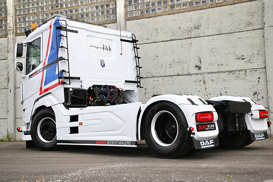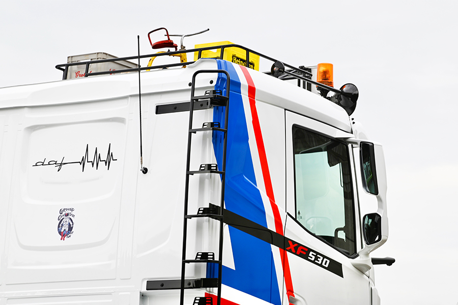 Dit keer is gekozen voor een cabine die nog niet veel zichtbaar is; een lage slaapcabine op de XF-variant. Nu is het zo, dat DAF de geïntegreerde stand-airco inmiddels ook leverbaar heeft gemaakt op andere cabine-varianten dan de XG+. Dus het dakrek zit het klimaatbeleid van de chauffeur in ieder geval niet in de weg. Uiteraard kon hierdoor het trapje, aan weerszijde van de achterkant van de cabine, niet ontbreken. En wat te denken van de Engelse zonneklep? Een op maat gemaakte variant voor een uniek project. Dit tezamen met de lichtbak incl. verstralers, zwaailampen en luchthoorns zetten het ’oldskool’ gevoel éxtra kracht bij. De bumperspoiler, hoekschilden, side-skirt verlengers (incl. opvulhoekje) en de spatscherm-verbreders geven de truck extra body.