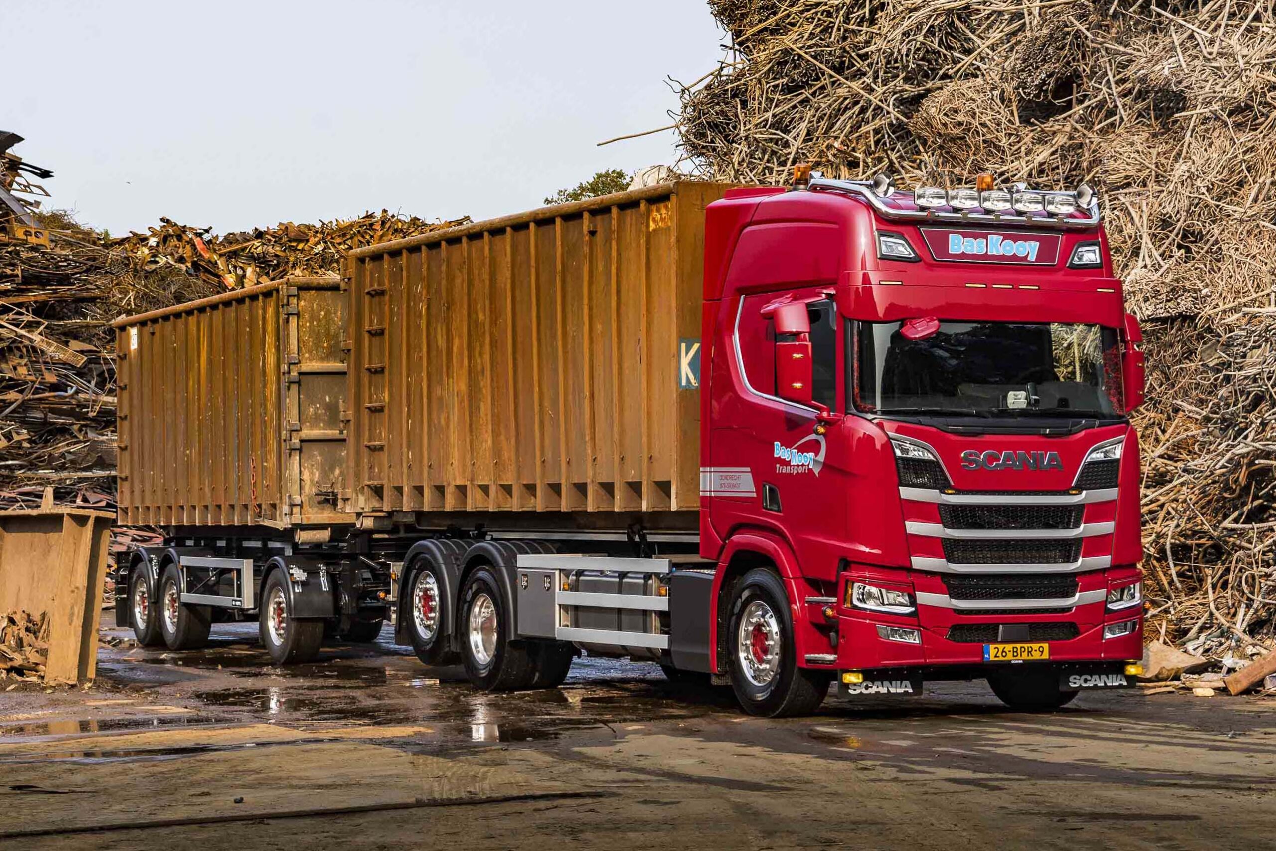 De vloot van Bas Kooij bestaat voor 99 procent uit Scania’s. “Onze 34 voertuigen rijden voor het leeuwendeel voor Jansen Recycling. Dat is één van de drie grootste recyclelaars in Nederland van metalen, zowel ferro als non ferro. Daar verwerken ze zo’n 500.000 ton metalen per jaar en een belangrijk deel daarvan rijden wij,” vertelt Roodenburg.