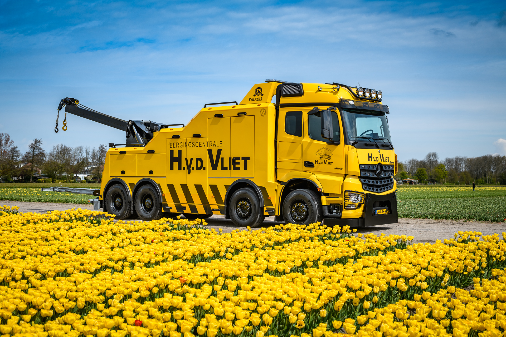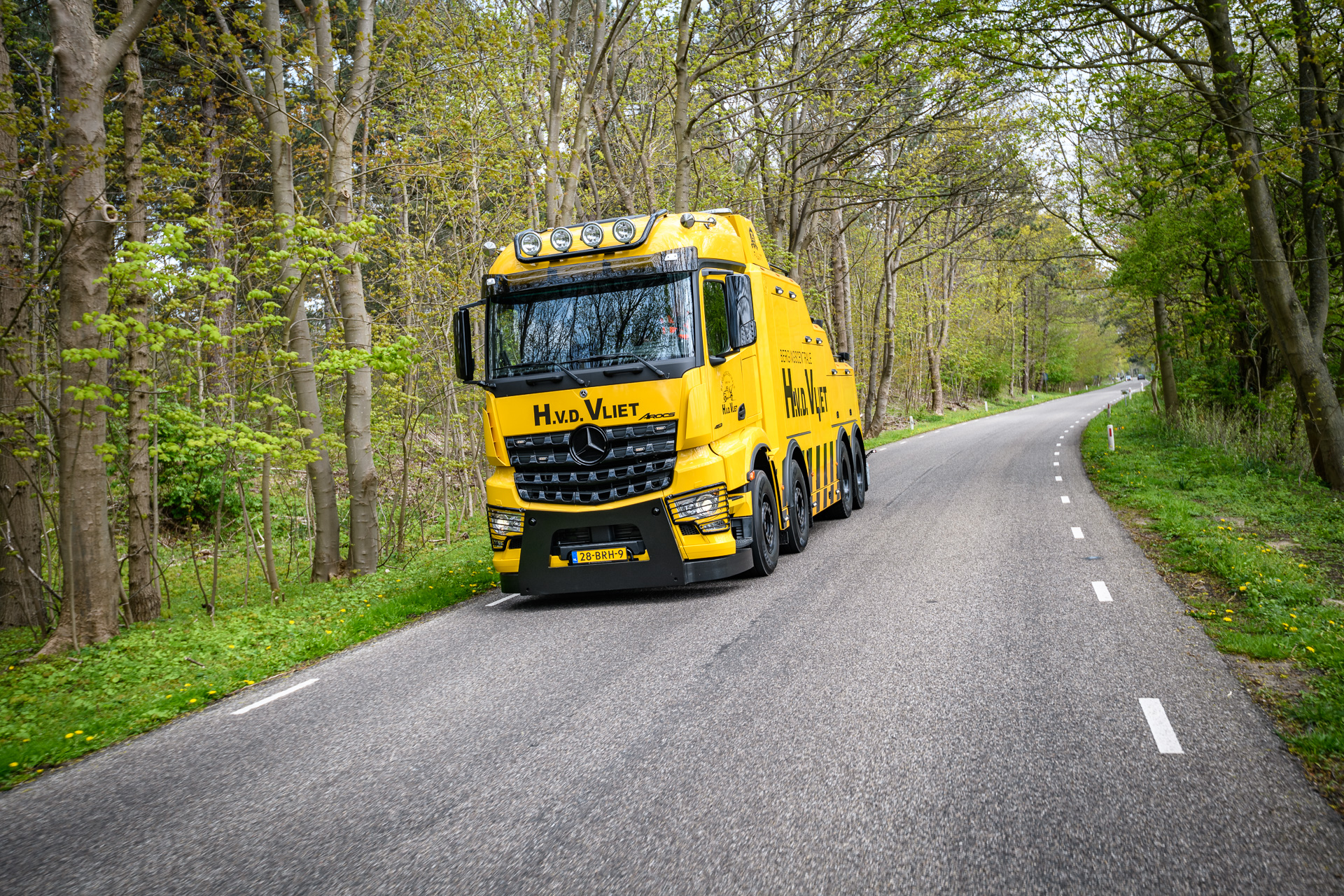 De nieuwe Arocs 4153 8×4 is het zwaarste model in de lijn en is uitermate geschikt voor het bergingswerk van zware voertuigen. Daan Dekker van Mercedes-Benz Trucks: “Het is natuurlijk geweldig om deze truck aan zo’n prachtige organisatie te mogen leveren. In deze uitvoering is de Arocs van alle gemakken voorzien.” De truck is uitgerust met een 13 liter, 530 pk motor en heeft een contragewicht van 2800 kg. Hierdoor geldt een maximum totaalgewicht van 150 ton. Zo kan van der Vliet zelfs de allerzwaarste voertuigen bergen.