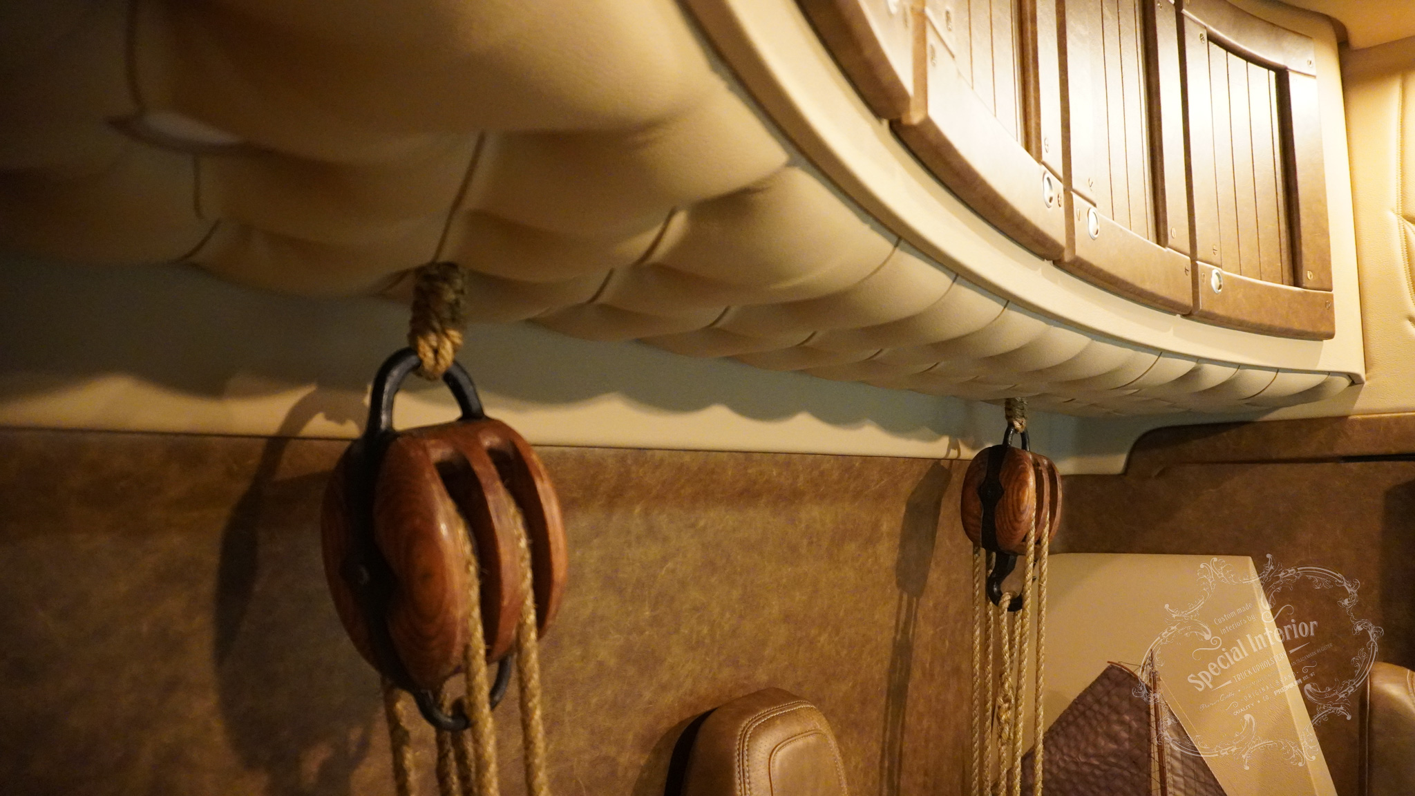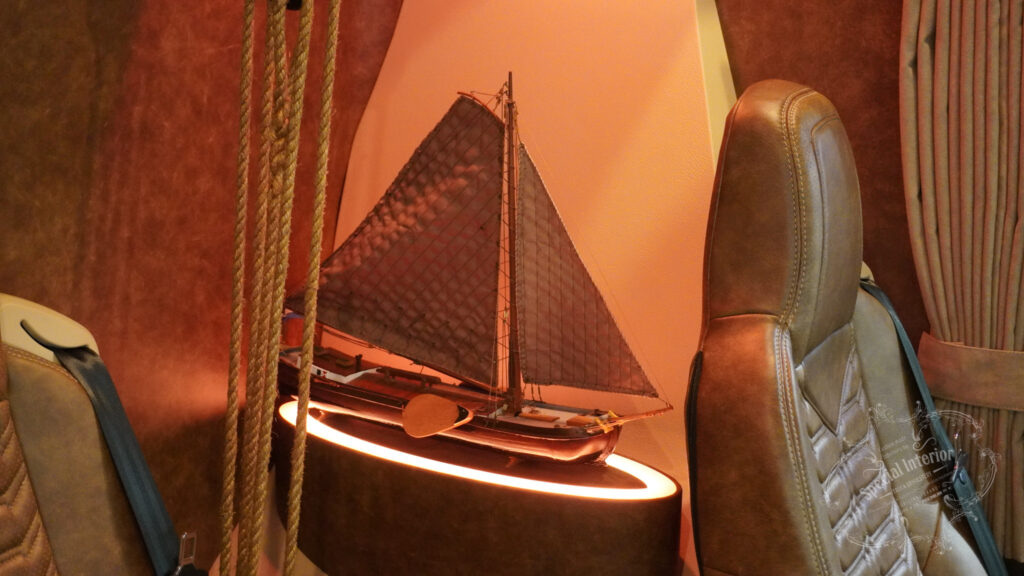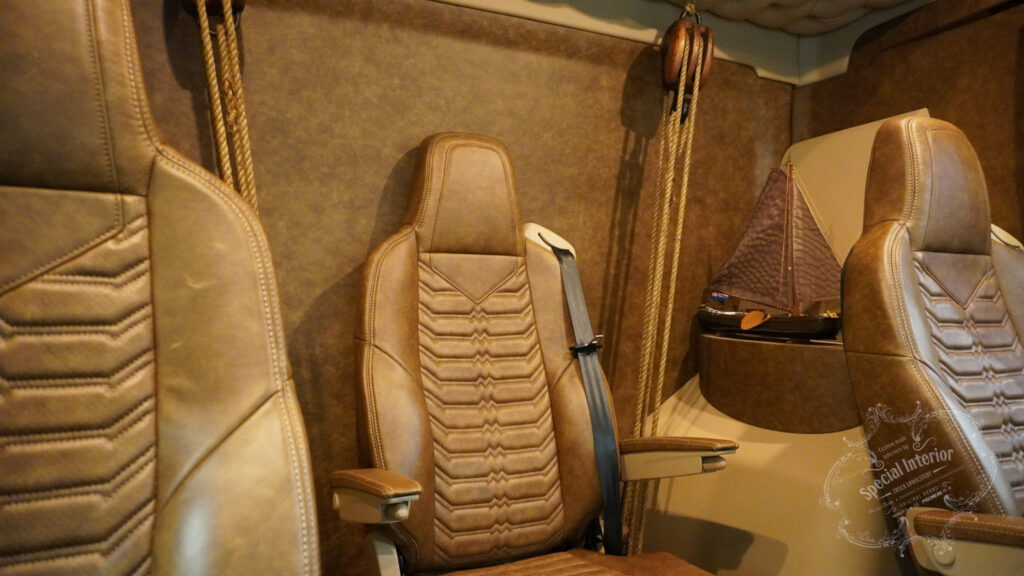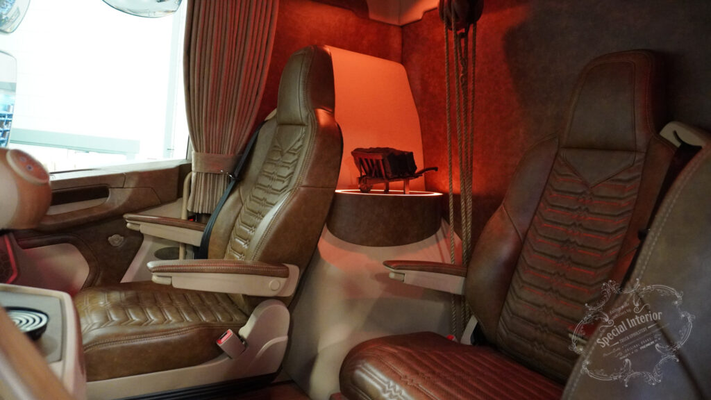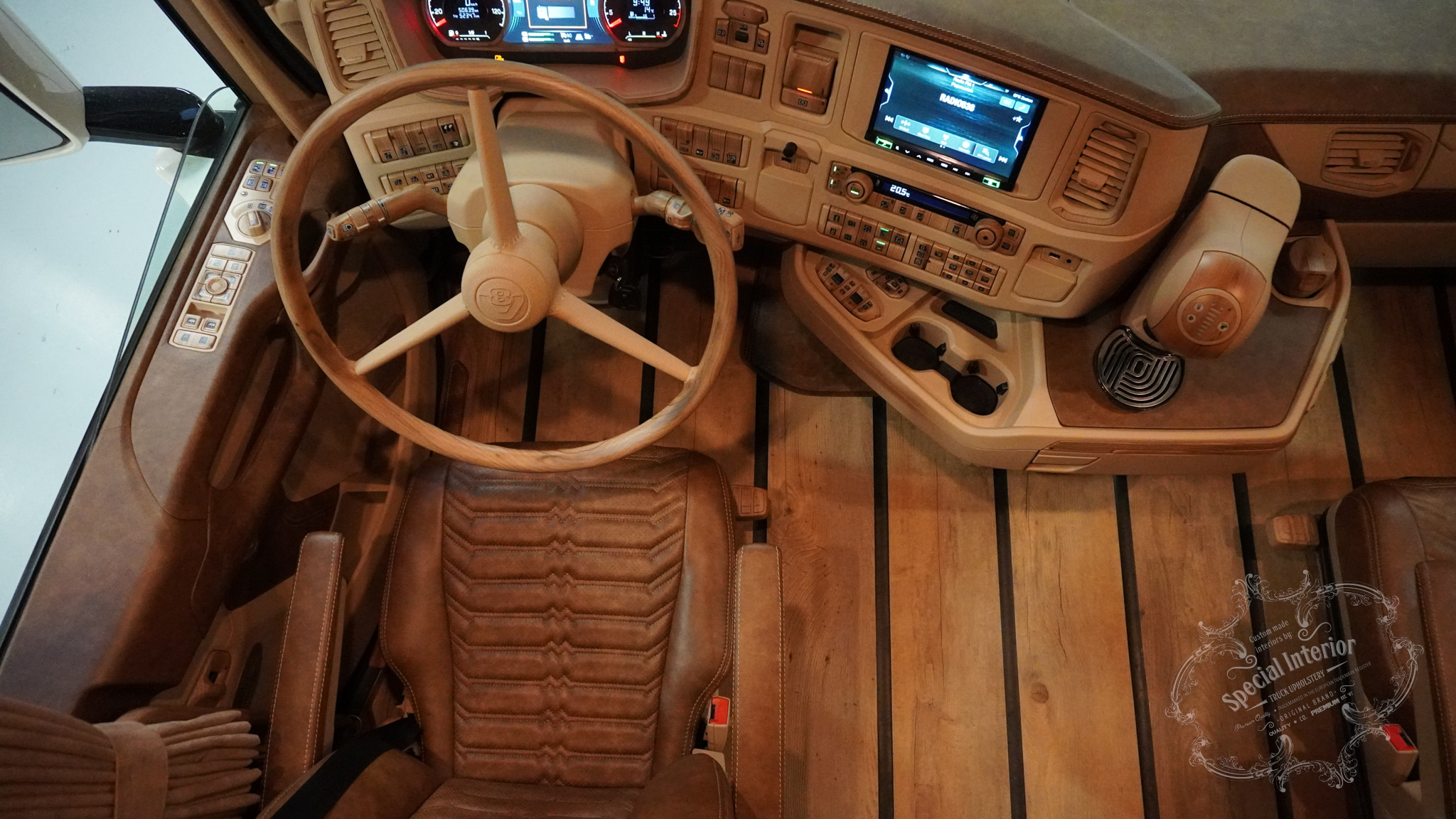 Om de showtruck een passend interieur te geven is hij de afgelopen maanden door Special Interior Truck Upholstery onder handen genomen. Daar hebben ze zich flink uitgeleefd. Zo is het bed naar boven de voorruit gebracht, is er een extra stoel tegen de achterwand geplaatst en is het interieur voorzien van een model van De Lastdrager I, een houten tjalkschip, en andere bijzondere details. Nu is de Scania echt af.