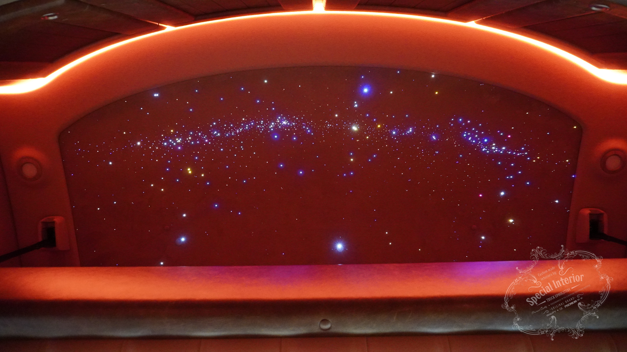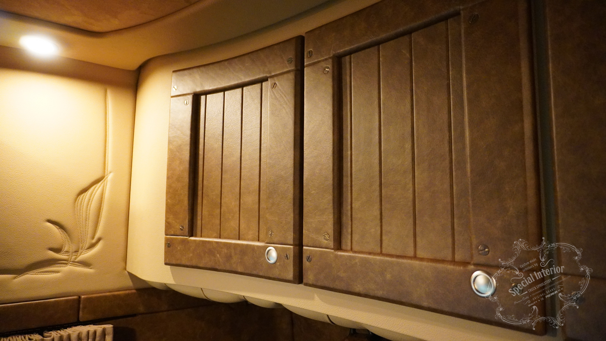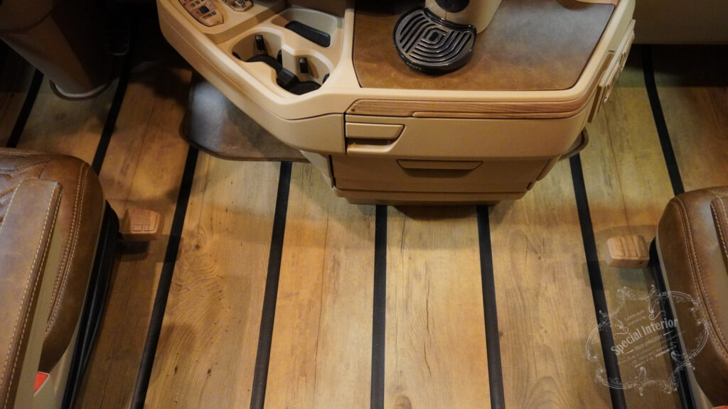 Om de showtruck een passend interieur te geven is hij de afgelopen maanden door Special Interior Truck Upholstery onder handen genomen. Daar hebben ze zich flink uitgeleefd. Zo is het bed naar boven de voorruit gebracht, is er een extra stoel tegen de achterwand geplaatst en is het interieur voorzien van een model van De Lastdrager I, een houten tjalkschip, en andere bijzondere details. Nu is de Scania echt af.