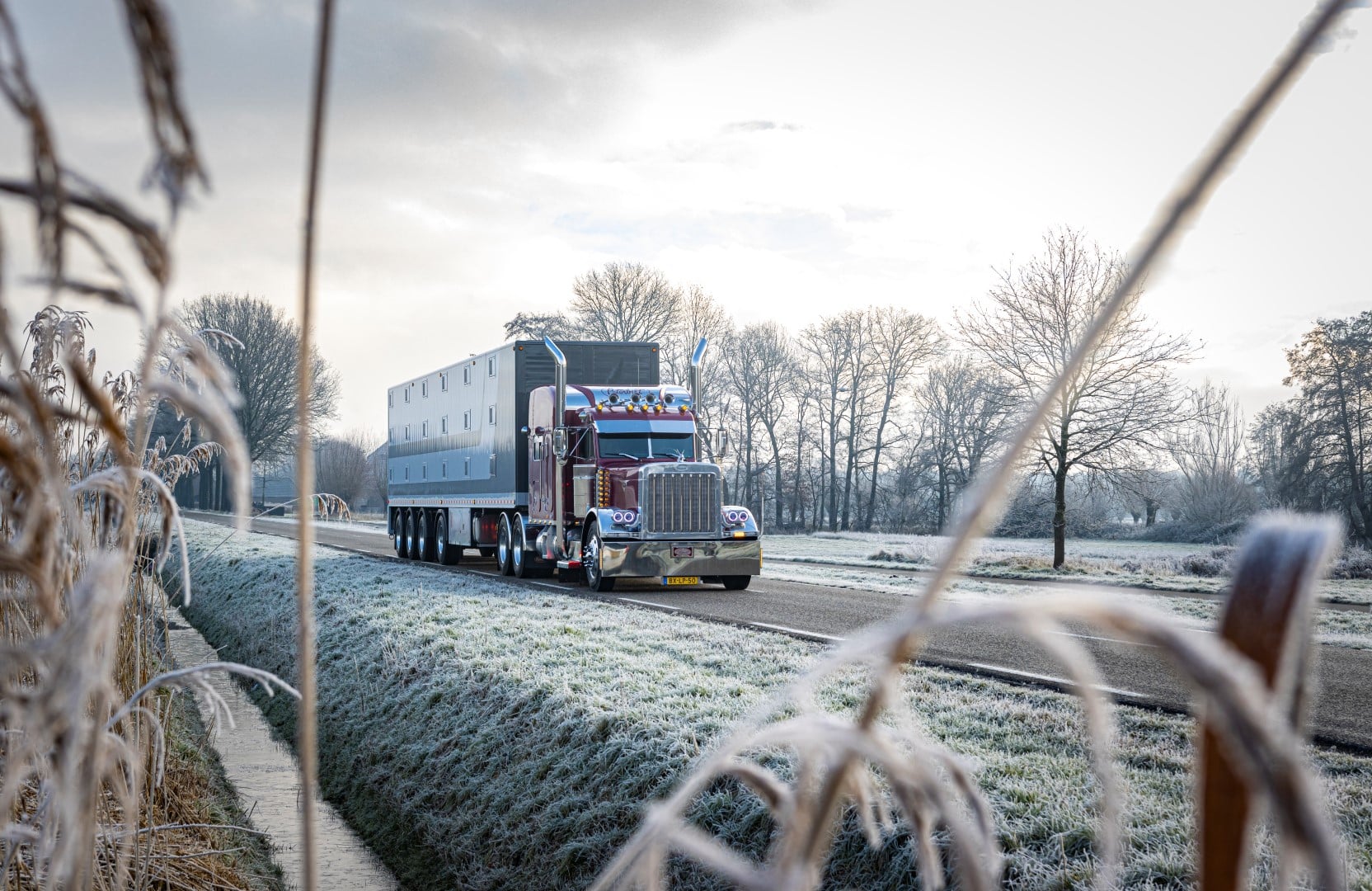 Voor een fotoshoot werd de hulp van Fons van den Berkmortel ingeroepen. Zijn Amerikaan is een bekende verschijning en zorgde voor een bijzonder plaatje op een koude januariochtend. De Peterbilt met daarachter de vierassige veetrailer lijken voor elkaar bestemd. Een machtig mooi Amerikaans tafereel in de Brabantse polder.