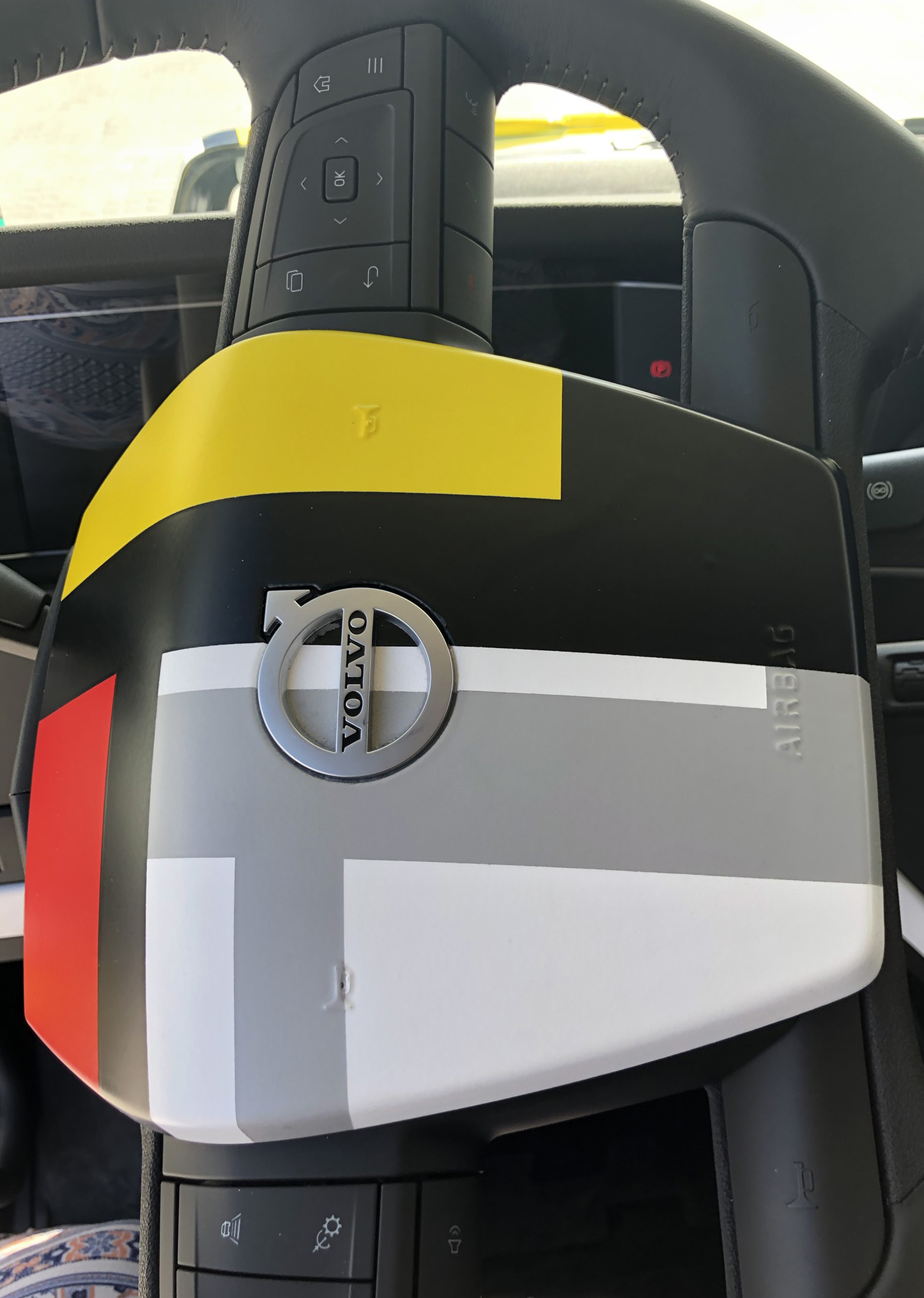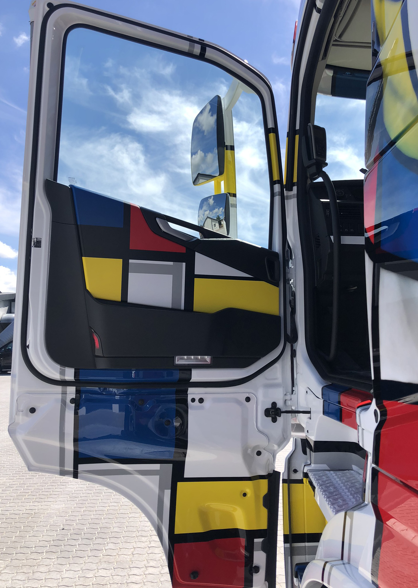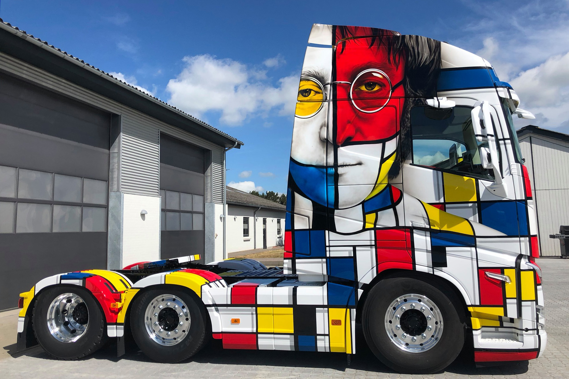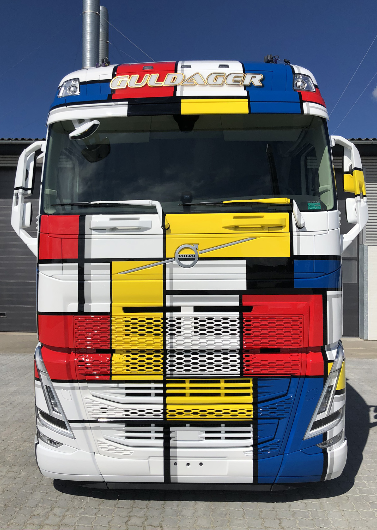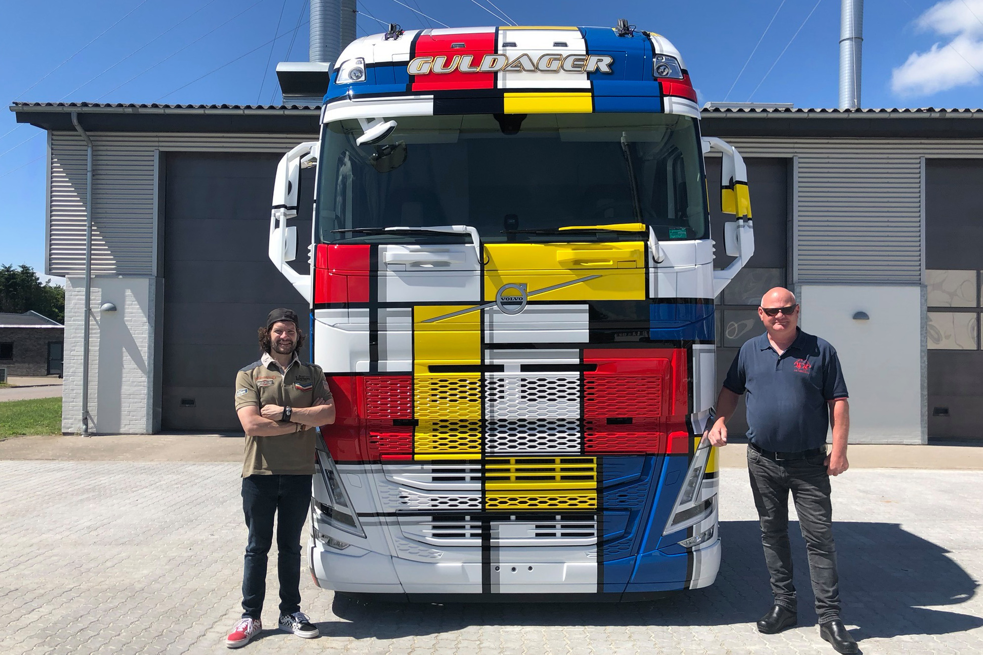 De Deense Henrik Guldager en Ray Hill hebben een ​​rollend kunstwerk gemaakt. Dit keer is het canvas de geheel nieuwe Volvo FH, die dit voorjaar werd gelanceerd, en de inspiratie is de Nederlandse kunstenaar Mondriaan.