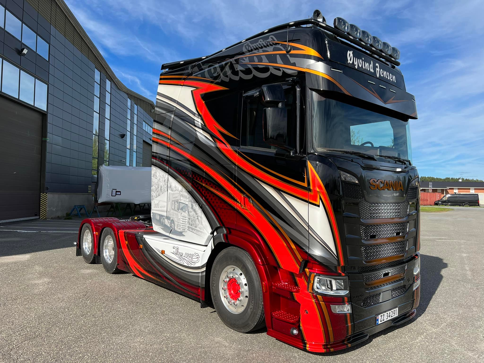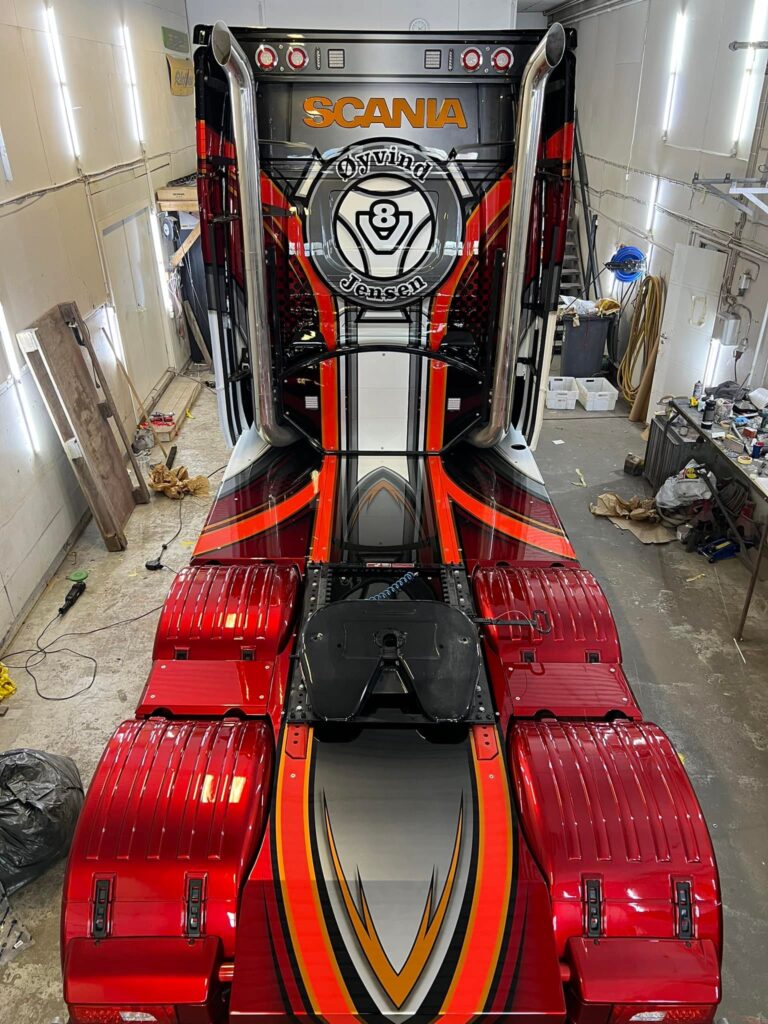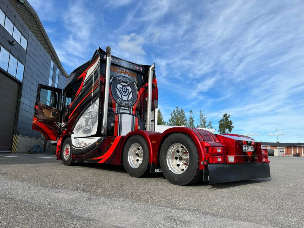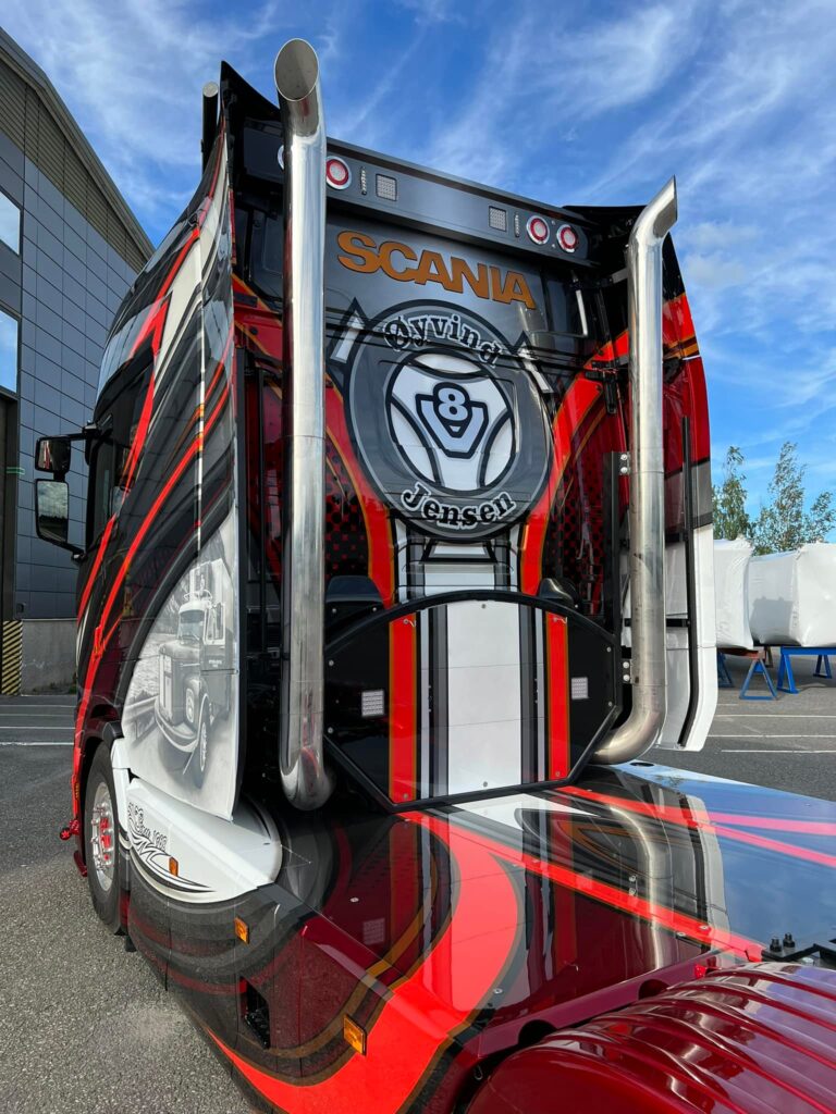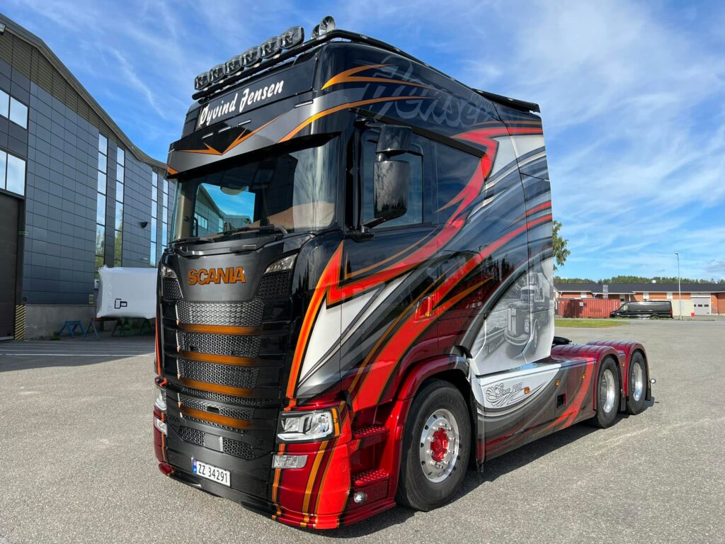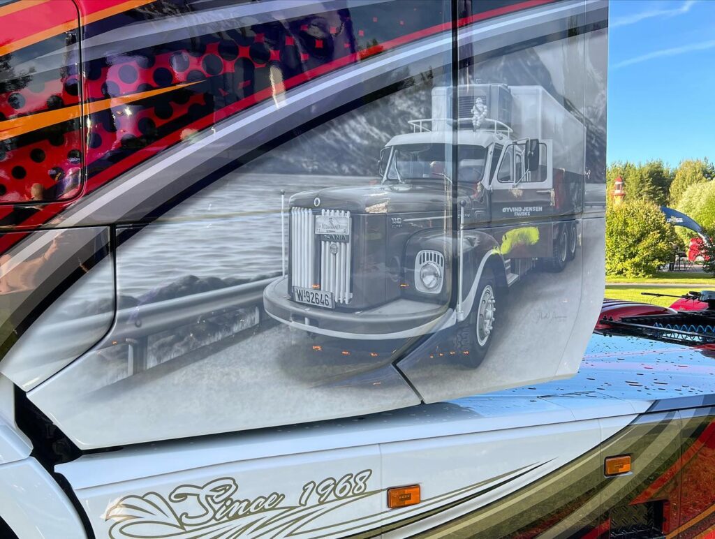 Als ode aan de Scania van het eerste uur van het transportbedrijf is deze in een fraaie airbrush aangebracht op de zijkant van de imposante cabine. Øyvind Jensen richtte zijn transportbedrijf in 1968 op.