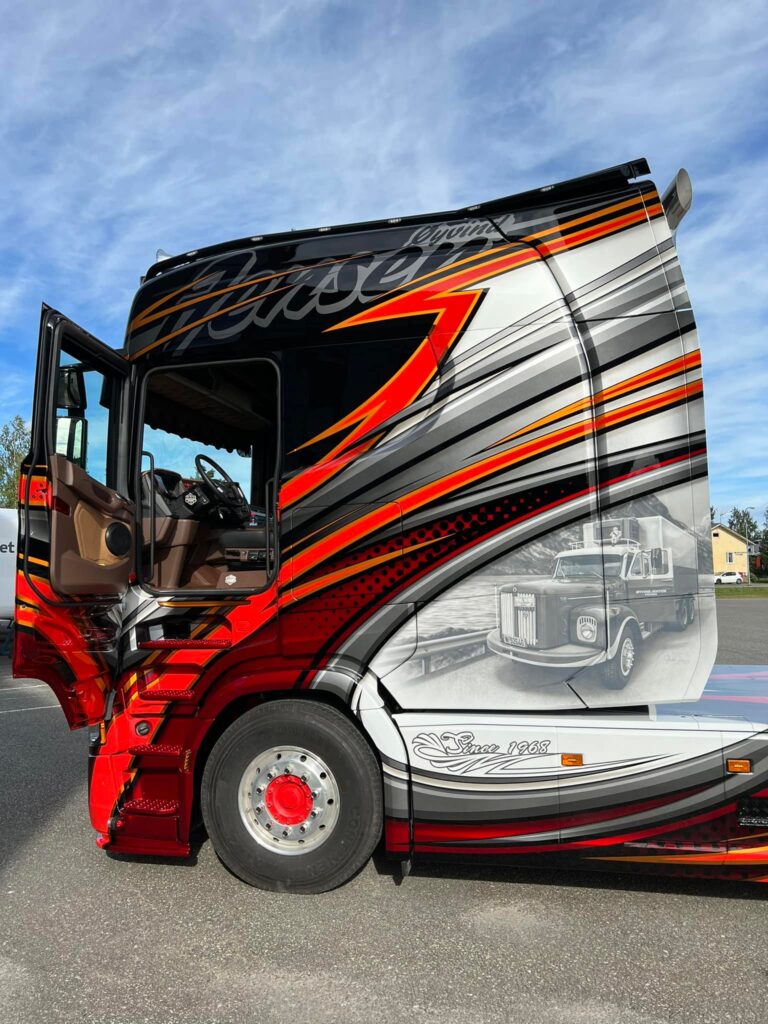 Zo heeft de Finse truckopbouwer een zeer bijzondere Scania Longline afgeleverd aan Øyvind Jensen Termotrans, een Noors transportbedrijf gespecialiseerd in koel- en vriestransport. Als je vrachtwagen van Ristimaa naast die van Øyvind Jensen zet valt op dat het kleurgebruik op elkaar geïnspireerd is.