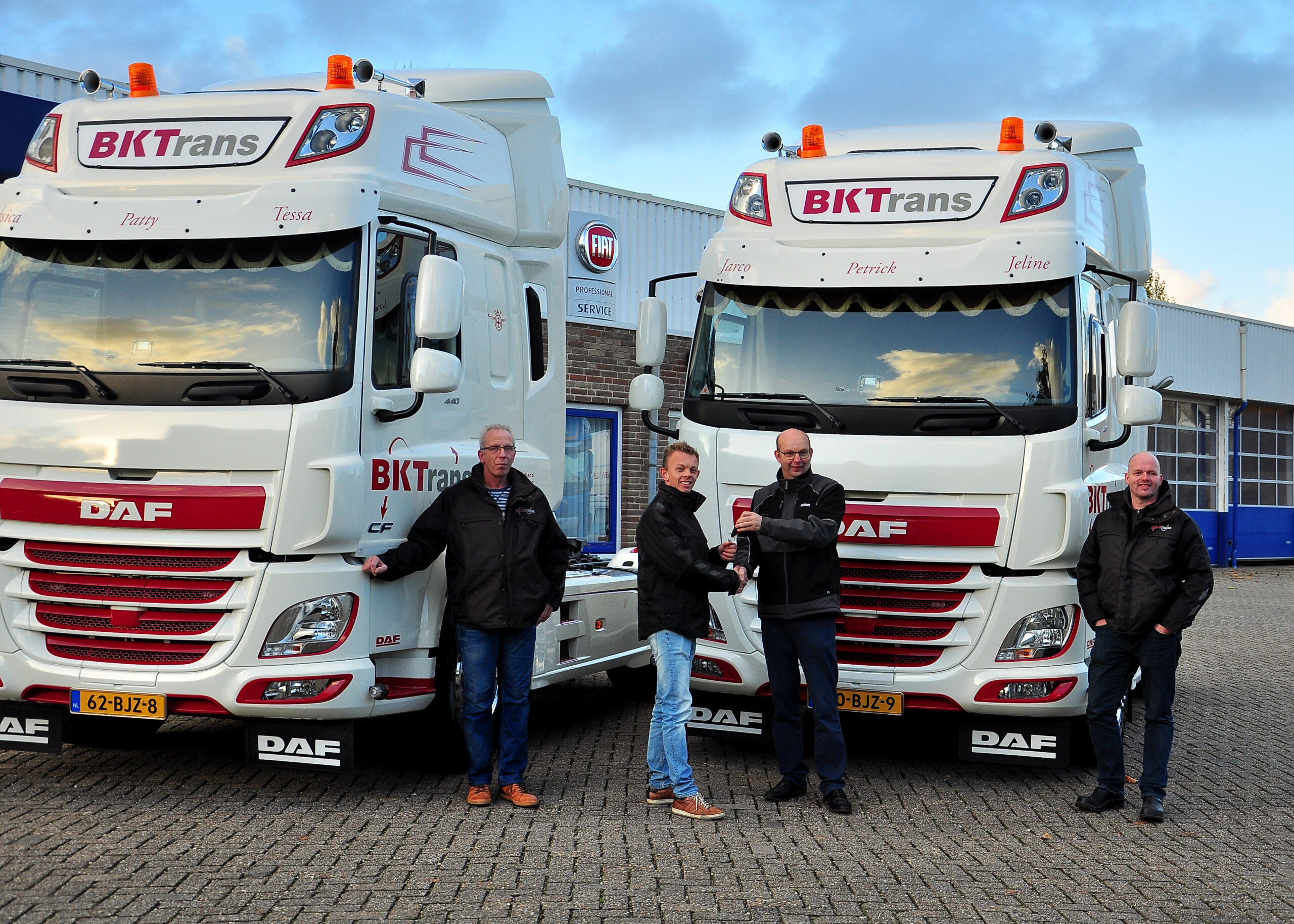 Op de hoofdfoto: links chauffeur Henny van der Neut, links-midden: Bas Kemp, Directeur BKTrans, rechts-midden: Anton van der Niet, verkoper Blom-DSW, rechts: chauffeur Erik Boom.