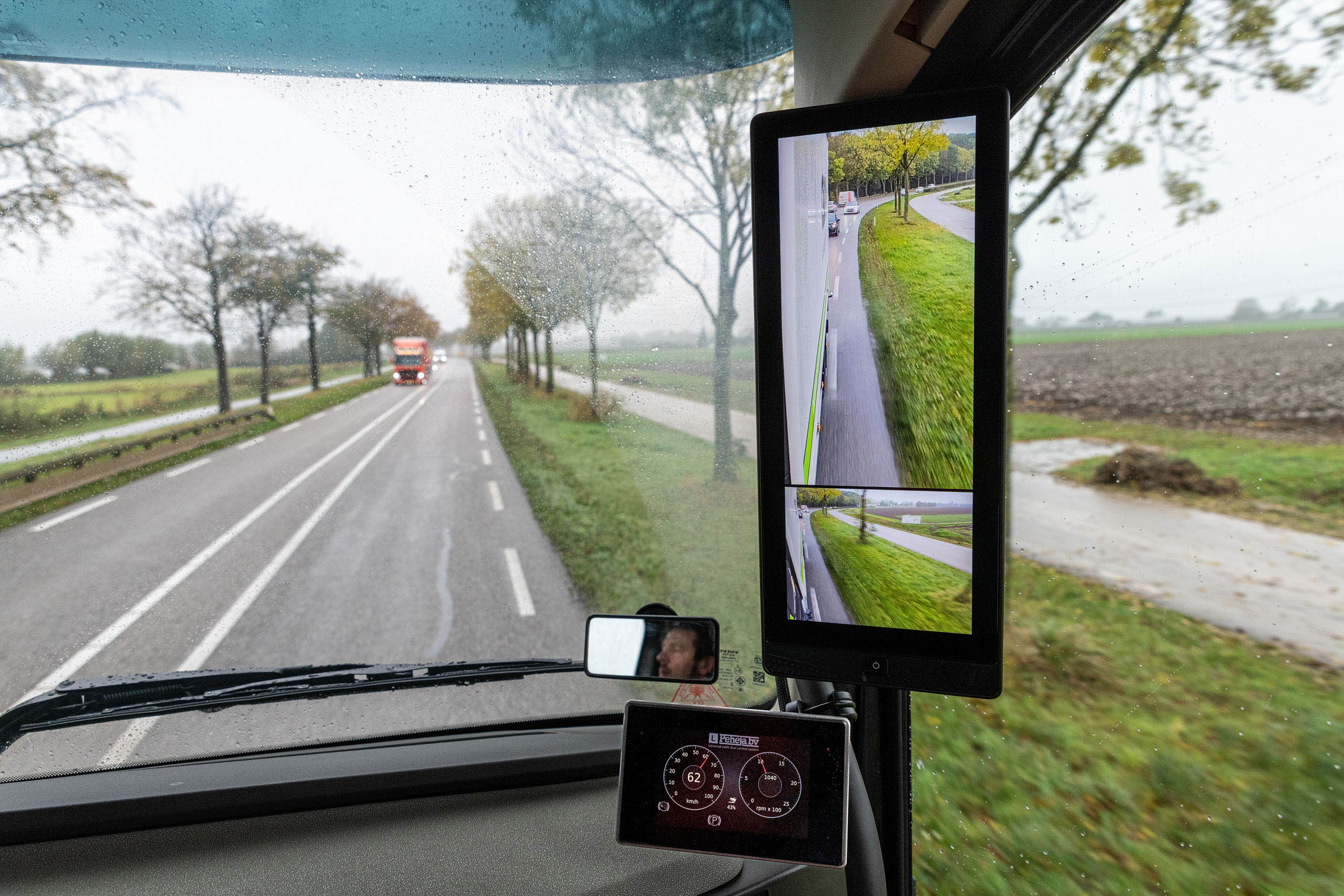 “Hét grote voordeel is dat je veel minder dode hoek hebt. Als je een rotonde oprijdt of een weg oversteekt, belemmeren spiegels soms het zicht: er verdwijnt wel eens een auto of een fietser achter een spiegel. Bij een lestruck speelt dat nog eens extra omdat je normaal gesproken dubbele spiegels hebt, voor zowel de leerling als de instructeur. Met het camerasysteem is dat probleem helemaal verdwenen. Wat mij ook opvalt is dat je haarscherp beeld hebt, ook als het buiten grauw en miezerig weer is. Dat geldt ook voor rijden in het donker, dan kun je night vision inschakelen. We hebben een extra camerasysteem laten monteren dat de resterende dode hoek in beeld brengt. Hiermee zie je als chauffeur meer dan met front- en trottoirspiegels.”