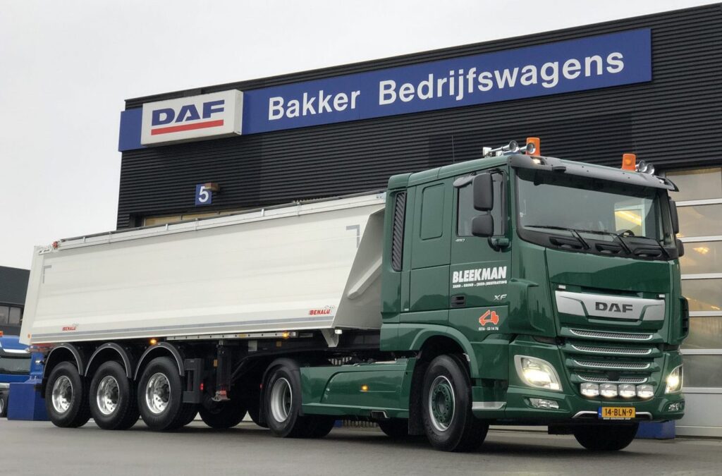 Na 13 jaar was het gisteren eindelijk zover voor chauffeur Gudo Neijenhuis van Bleekman, de aflevering van een nieuwe DAF. Een echte chauffeur en vakman maar bovenal een trotse ambassadeur voor het merk DAF en de firma Bleekman. Na jaren lobbyen kon hij gisteren zijn nieuwe paradepaardje in ontvangst nemen. Een full options XF Comfort Cab met de MX13 motor voorzien van 480pk, LED verlichting rondom, lederen super air stoelen, luchtgeveerde cabine, camerasysteem, speciaal spuitwerk incl. blanke lak en fraaie verstralers in de grille. Aan niets ontbreekt het bij deze DAF. Bleekman heeft er meteen werk van gemaakt en ook een nieuwe Benalu trailer aangeschaft, waarvan de eerste as hefbaar is en de laatste as stuurbaar. Een wendbare combinatie.