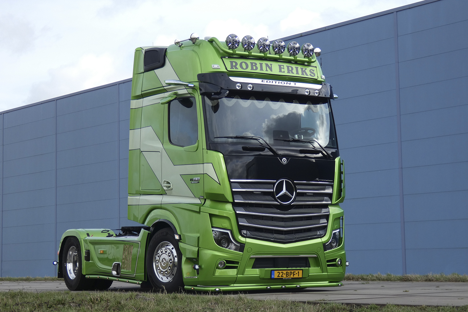 De nieuwe Actros van Robin Eriks valt op, van buiten én van binnen. Het thema van de truck is ‘man on the moon’. Reden genoeg om de felgroene Mercedes eens van dichtbij te gaan bekijken.