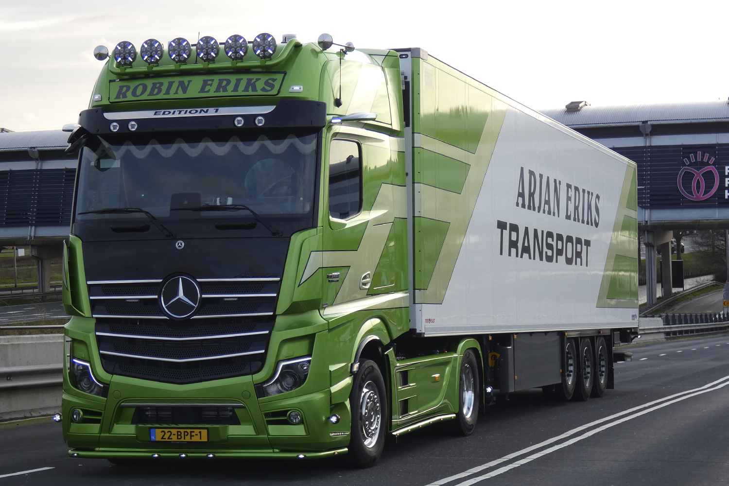 Dat de nieuwe truck van Robin Eriks een Mercedes moest worden, stond direct vast. “Mijn vorige auto was ook een Actros en die beviel erg goed. En ik vind die nieuwe echt mooi met zijn digitale dashboard. En dan die camera’s in plaats van buitenspiegels; dat maakt hem net even anders. Het MirrorCam-systeem werkt overigens fantastisch. Ik ben er heel tevreden over.” Bij het bestellen werd zo’n beetje het hele optielijstje aangekruist, dus alle veiligheids- en assistentiesystemen zitten erop. Daarnaast koos Robin voor een luchtgeveerde vooras. “Handig met die lowbar, dan rijd je hem niet zo snel stuk op stoepranden en drempel. Bovendien is het heel comfortabel.”