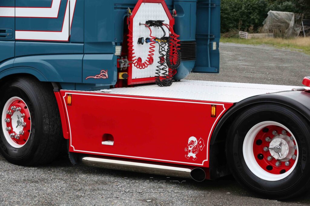 Het rode chassis en de onderlijn in dezelfde kleur vormen een mooi contrast met de kleuren op de cabine. “Die vloeken wel met de trailer, maar het gaat mij erom dat de trekker er mooi uitziet”, lacht Michael. Daar heeft hij dan ook volop aandacht aan besteed. Het gehele chassis is dichtgebouwd met kisten en afgedekt met een traanplaatvlonder. “Dat is mooi en gemakkelijk met het aankoppelen van de trailers”, vertelt de Deen. Trots is hij op de sidepipe onder de tank aan de bestuurderskant. “Dat zag je vroeger en wilde ik nu ook weer graag onder de DAF. Hij geeft dan wel geen herrie zoals vroeger, maar ziet er wel mooi uit.”