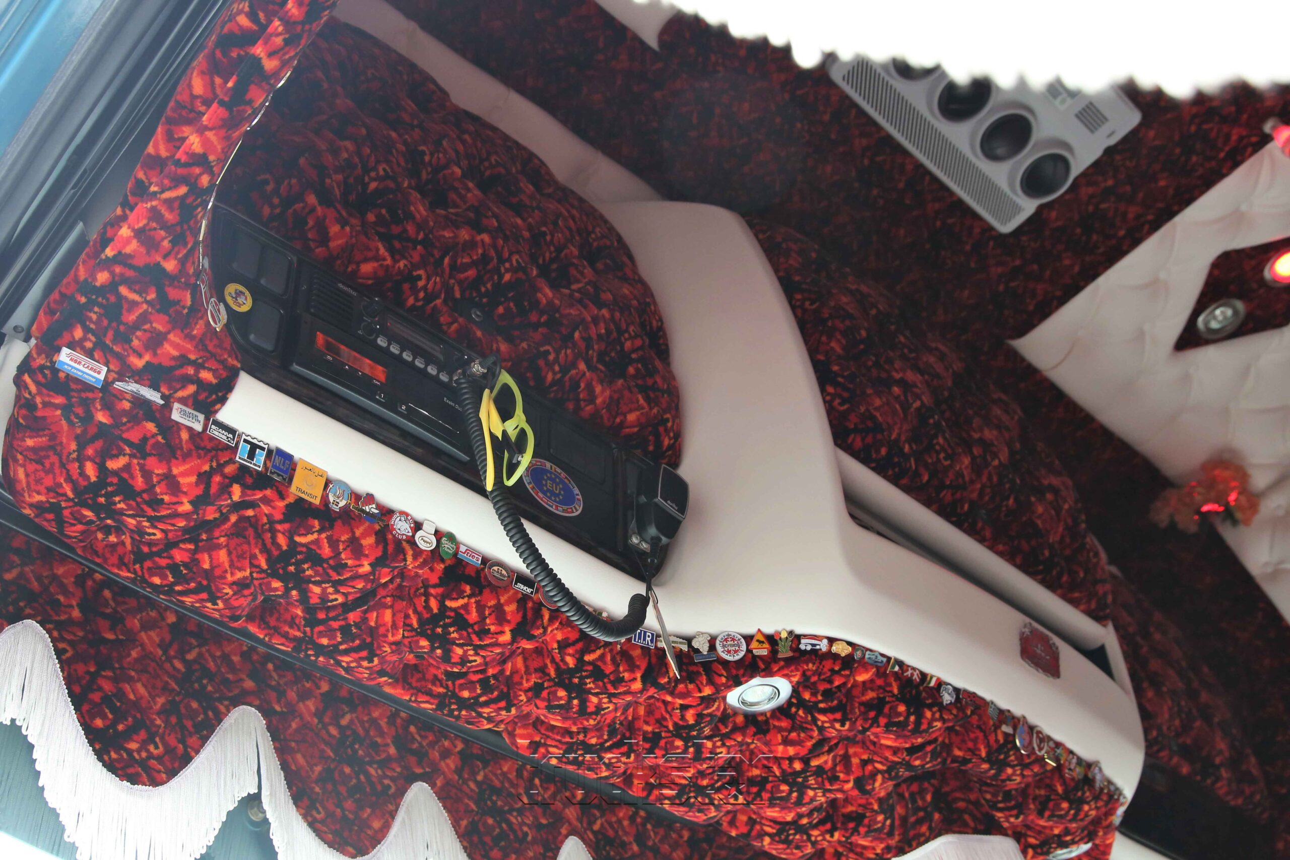 Ook over de aankleding van de cabine heeft Michael niet lang getwijfeld. “Rood pluche en met een dikke geluidsinstallatie”, lacht hij en doet de deur open. Veel van de kunststof delen van het dashboard en in de rest van de cabine zijn ook wit gespoten. Wie boven de voorruit kijkt, ziet allerlei speldjes van de meest uiteenlopende bedrijven en landen. “Die heb ik in de achttien jaar dat ik rijd allemaal verzameld op mijn reizen door Europa met de vrachtwagen of bij truckshows”, zegt Michael. In de bekleding van de bestuurdersstoel is de tekst ‘The Flying Dane’ geborduurd. Een mooie variatie op ‘Vliegende Hollander’.