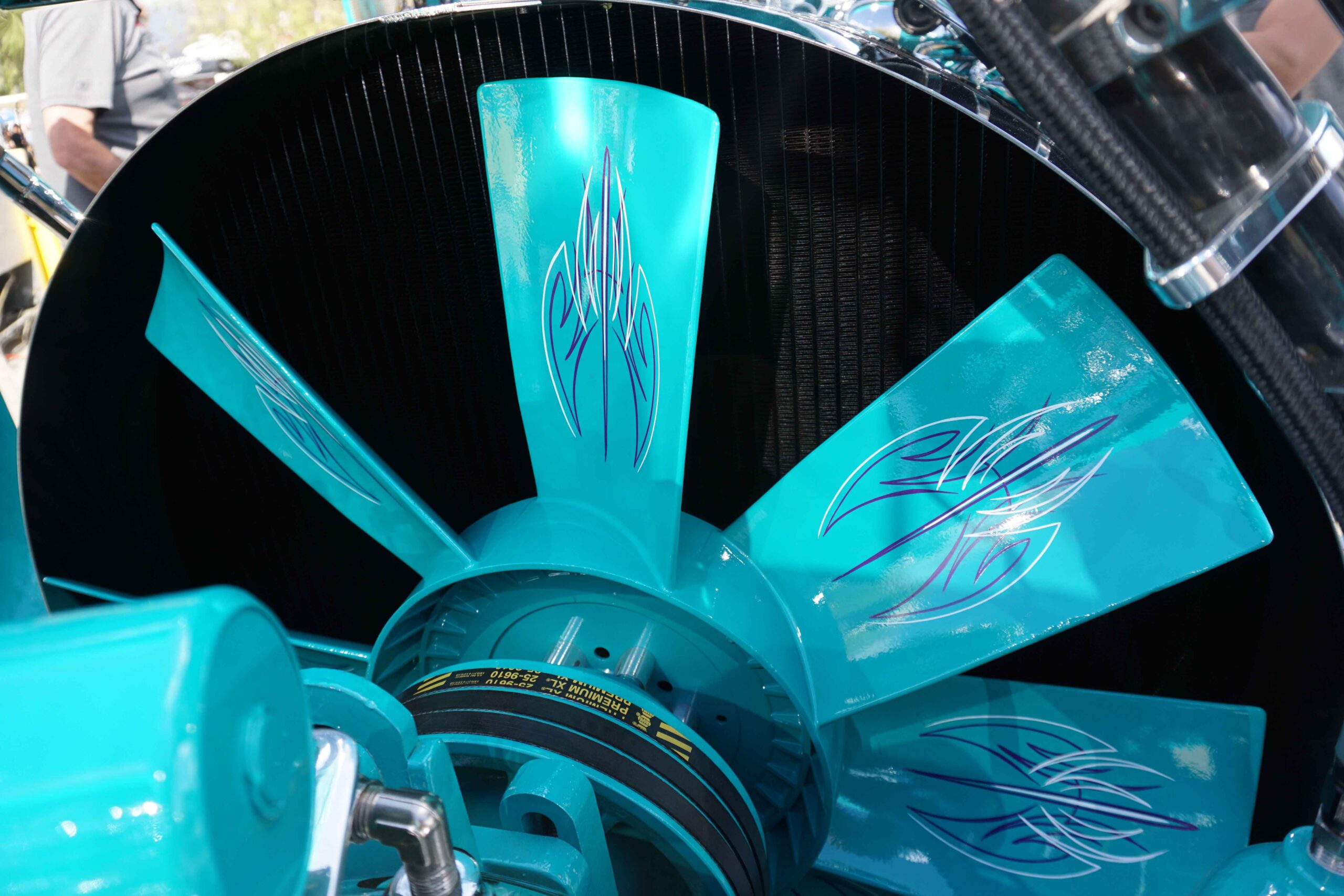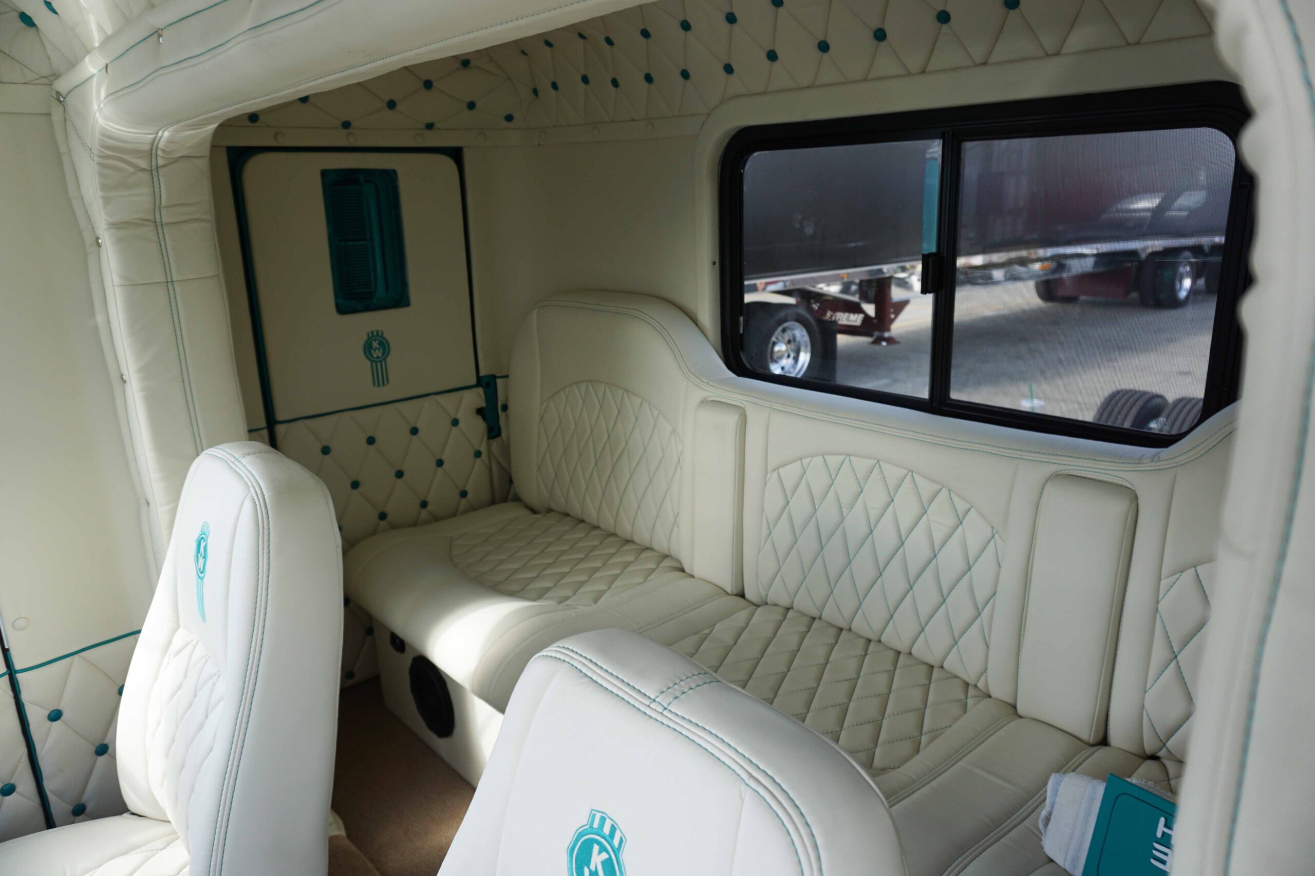 Na het grove werk werd het tijd voor de afwerking. Het spuitwerk zit er strak op en Eds striping komt mooi uit op dit model. Voor de oplettende kijker zitten er veel details verstopt. Er zijn zelfs pinstripes op de bladen van de vin aangebracht. “Ik wilde een opvallende showtruck met de juiste details, maar niet schreeuwerig.” De stijl van buiten is doorgetrokken naar binnen. Het interieur is voorzien van crèmekleurig leer met groene details en glimmende instrumenten. Achter de voorstoelen maakte een bed plaats voor een comfortabele bank. De opening van de cockpit naar de ‘slaapcabine’ is vergroot, waardoor er meer ruimte ontstaat voor de passagiers. “Ideaal voor de kleinkinderen”, lacht Ed.