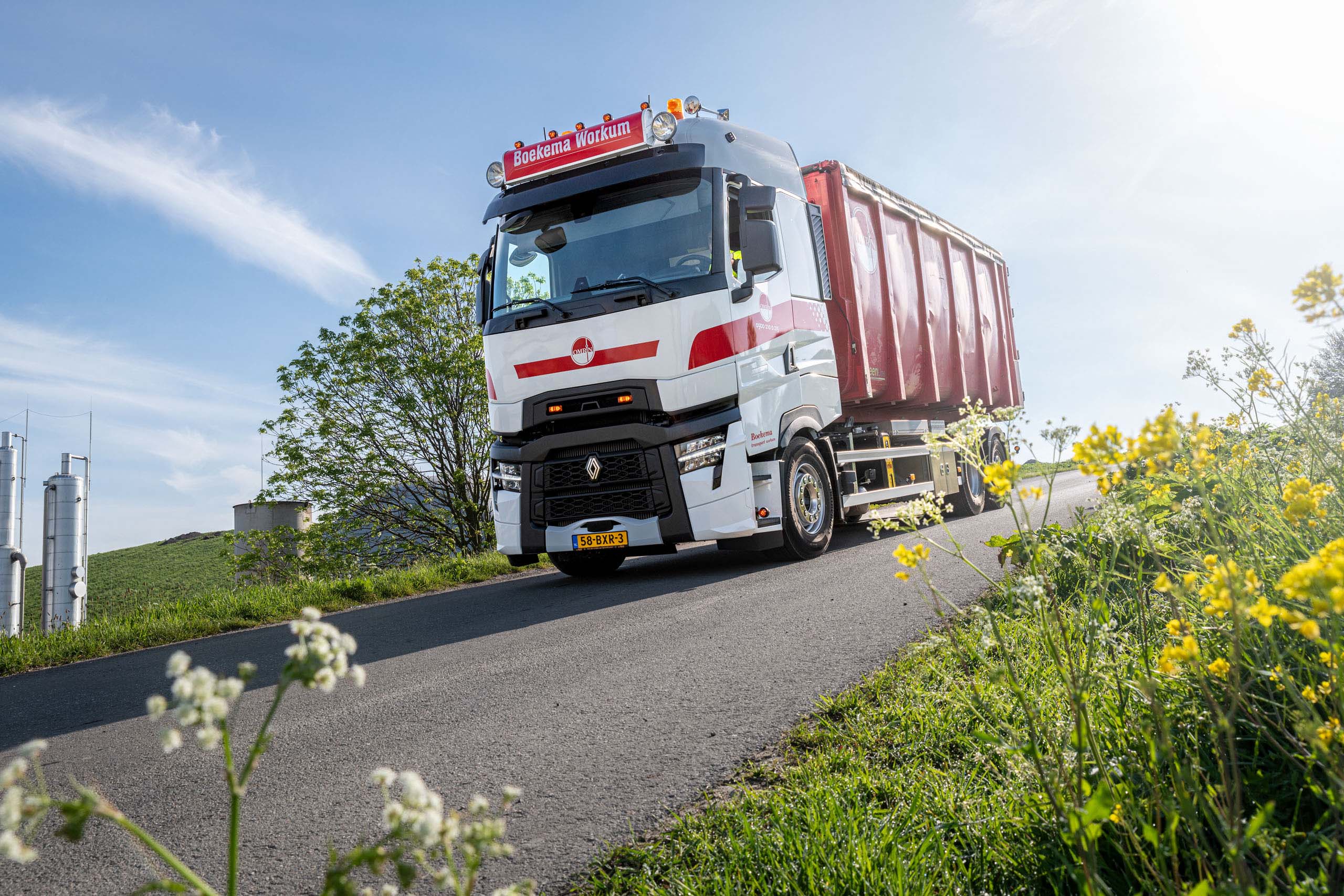Boekema rijdt met de Renault Trucks T High dedicated voor Omrin, een afvalverwerkingsbedrijf dat actief is in Noord-Nederland. Omrin zamelt het afval van ruim 1,5 miljoen mensen en 10.000 bedrijven in. Boekema: “We brengen onder meer afval, dat is ingeleverd bij milieustraten van Omrin in Groningen en Friesland, naar verwerkers. De Renault Trucks T High is voorzien van een Hyva haakarmsysteem om containers te kunnen wisselen. Ook hebben we gekozen voor een gestuurde naloopas. Bij milieustraten is de ruimte soms beperkt en met een gestuurde naloopas kun je net wat korter draaien. Ook beperk je daarmee de bandenslijtage. Voor extra remkracht heeft deze truck Optibrake+.”