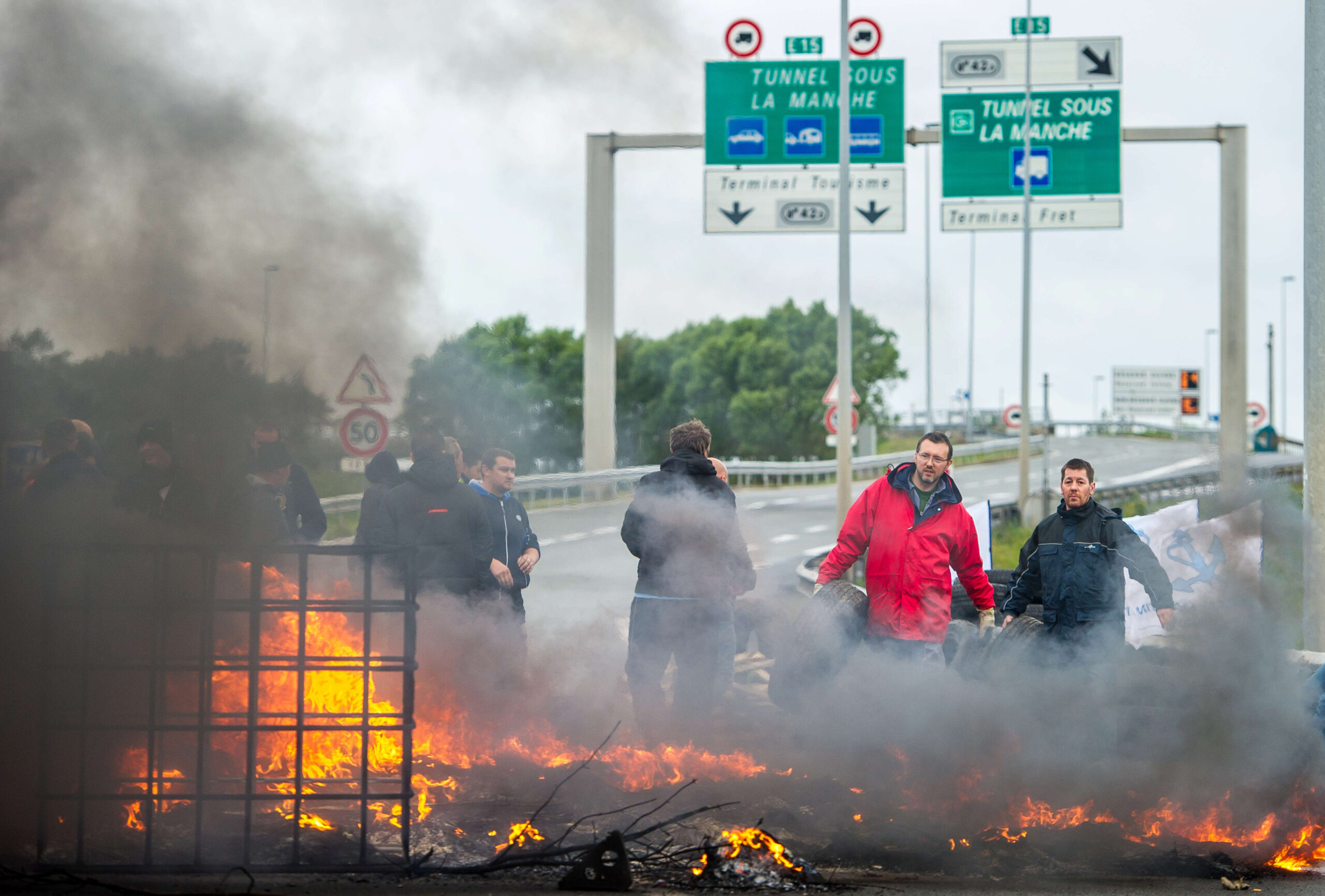 Foto: De toegangswegen naar de tunnel zijn door de stakende Fransen geblokkeerd met brandende barricades. (ANP)