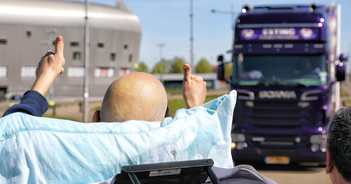 - Terminaal zieke Robert steekt zijn duimen op naar toeterende stoet trucks. Foto: Noah4All